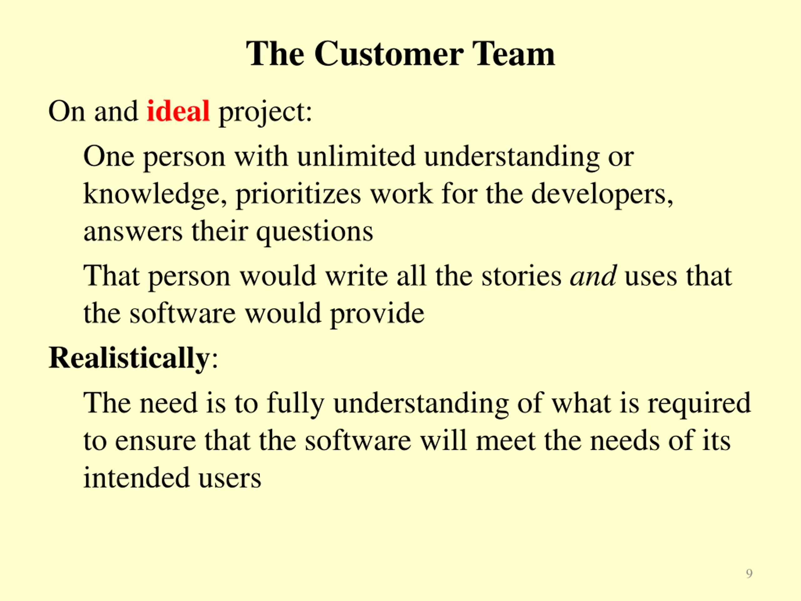 The Customer Team On and ideal project: One person with unlimited understanding or knowledge, prioritizes work for the developers, answers their questions That person would write all the stories and uses that the software would provide Realistically: The need is to fully understanding of what is required to ensure that the software will meet the needs of its intended users 9