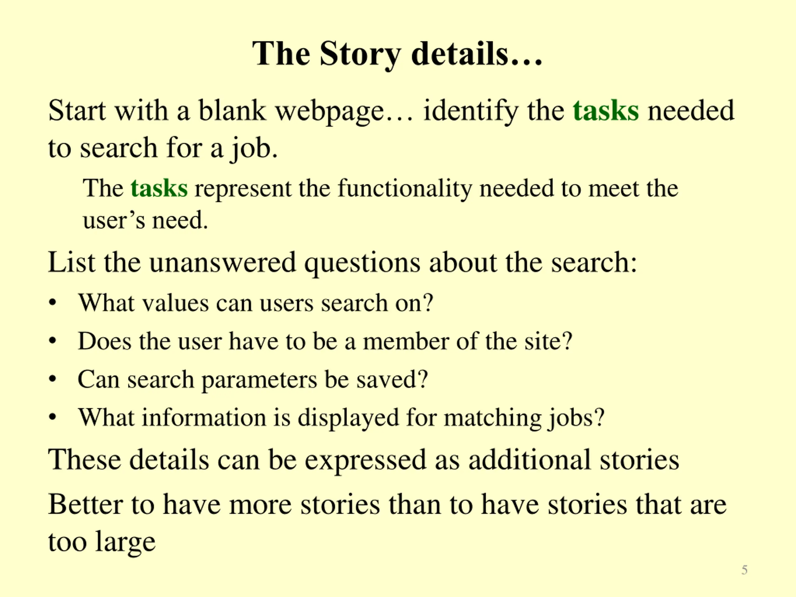 The Story details Start with a blank webpage identify the tasks needed to search for a job. The tasks represent the functionality needed to meet the user s need. List the unanswered questions about the search: What values can users search on? Does the user have to be a member of the site? Can search parameters be saved? What information is displayed for matching jobs? These details can be expressed as additional stories Better to have more stories than to have stories that are too large 5