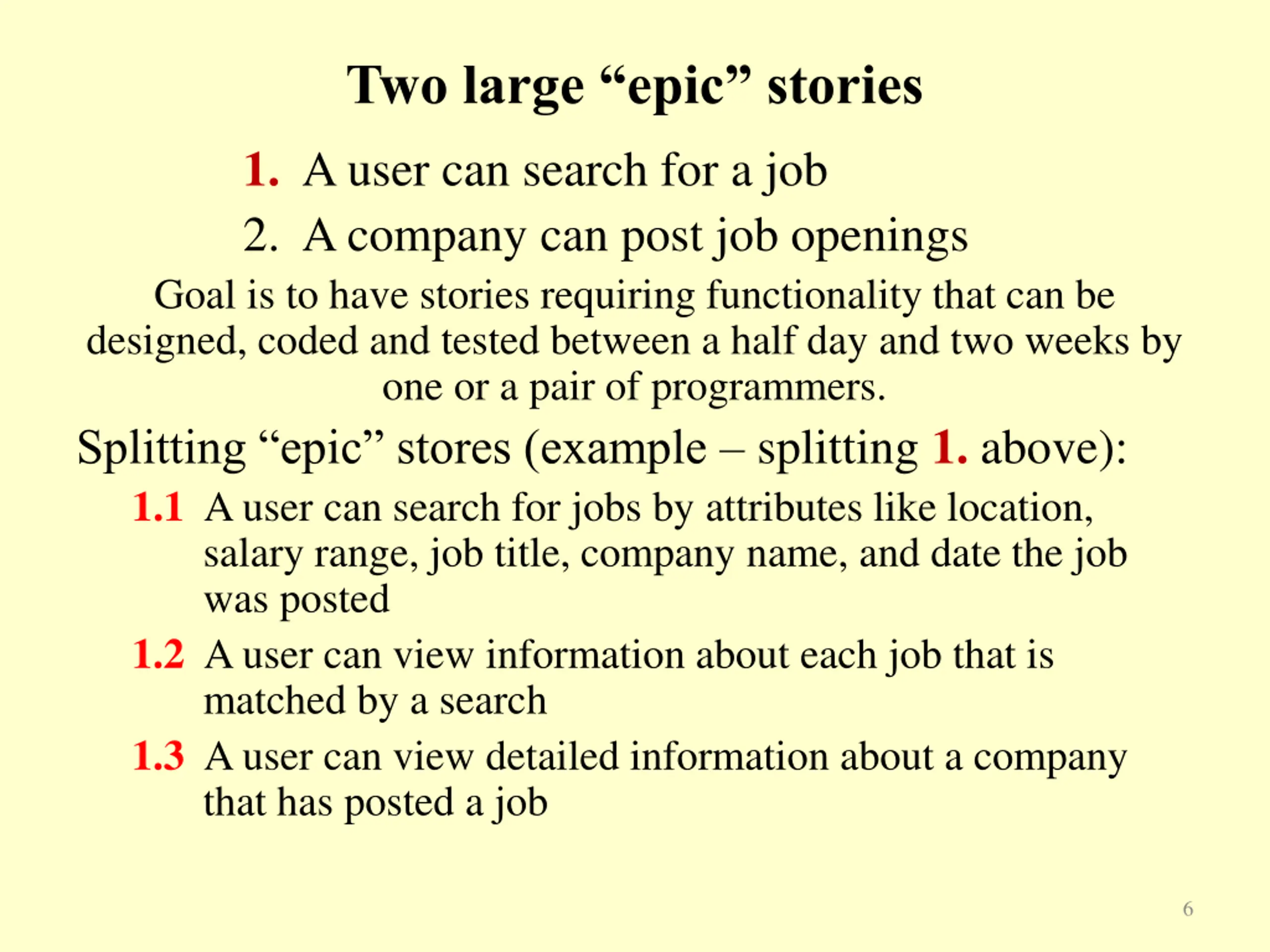 Two large epic stories 1. A user can search for a job 2. A company can post job openings Goal is to have stories requiring functionality that can be designed, coded and tested between a half day and two weeks by one or a pair of programmers. Splitting epic stores (example splitting 1. above): 1.1 A user can search for jobs by attributes like location, salary range, job title, company name, and date the job was posted 1.2 A user can view information about each job that is matched by a search 1.3 A user can view detailed information about a company that has posted a job 6