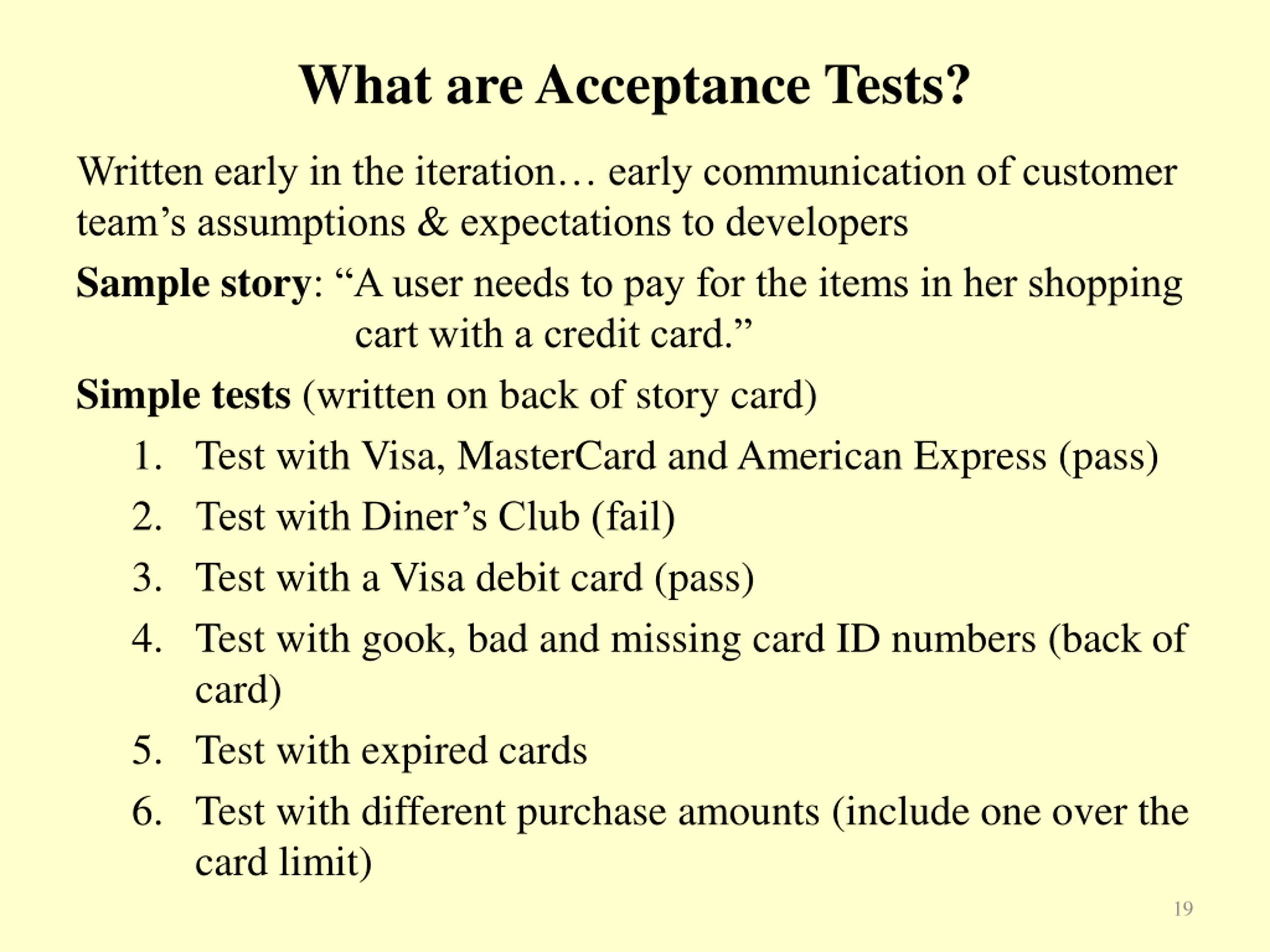 What are Acceptance Tests? Written early in the iteration early communication of customer team s assumptions & expectations to developers Sample story: A user needs to pay for the items in her shopping cart with a credit card. Simple tests (written on back of story card) 1. Test with Visa, MasterCard and American Express (pass) 2. Test with Diner s Club (fail) 3. Test with a Visa debit card (pass) 4. Test with gook, bad and missing card ID numbers (back of card) 5. Test with expired cards 6. Test with different purchase amounts (include one over the card limit) 19
