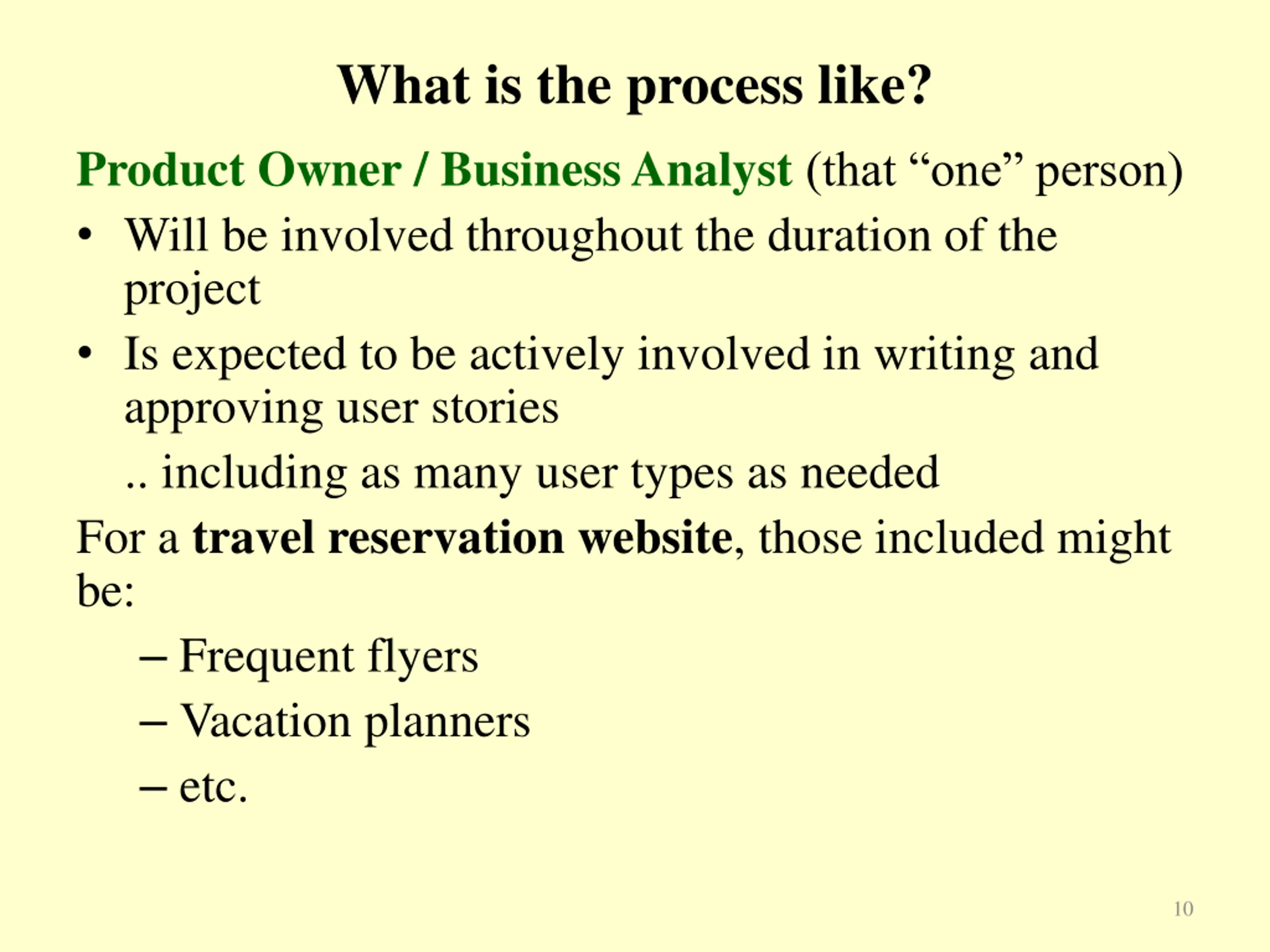 What is the process like? Product Owner / Business Analyst (that one person) Will be involved throughout the duration of the project Is expected to be actively involved in writing and approving user stories .. including as many user types as needed For a travel reservation website, those included might be: Frequent flyers Vacation planners etc. 10