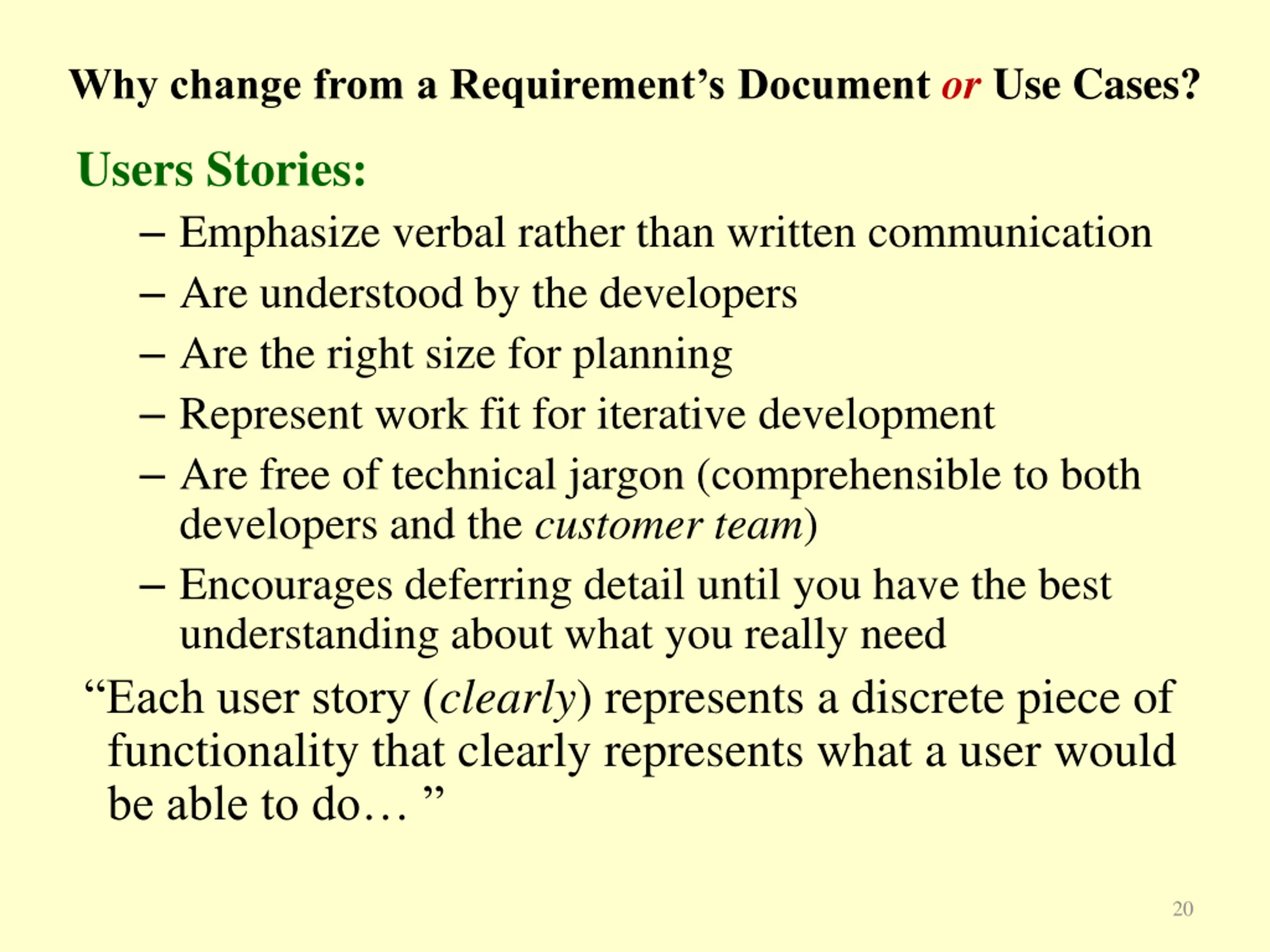Why change from a Requirements Document or Use Cases? Users Stories: Emphasize verbal rather than written communication Are understood by the developers Are the right size for planning Represent work fit for iterative development Are free of technical jargon (comprehensible to both developers and the customer team) Encourages deferring detail until you have the best understanding about what you really need Each user story (clearly) represents a discrete piece of functionality that clearly represents what a user would be able to do 20