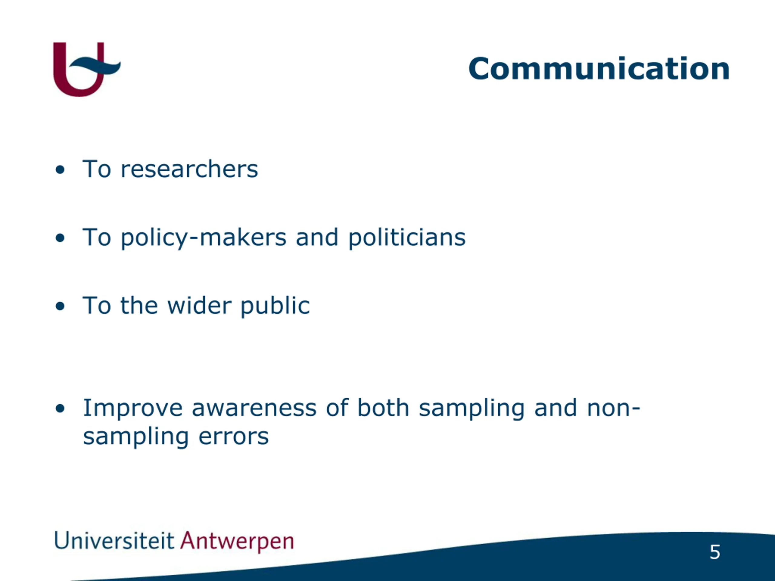 Communication To researchers To policy-makers and politicians To the wider public Improve awareness of both sampling and non- sampling errors 5