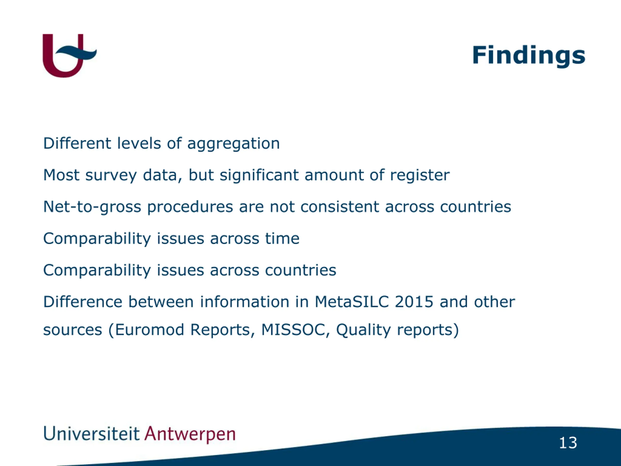 Findings Different levels of aggregation Most survey data, but significant amount of register Net-to-gross procedures are not consistent across countries Comparability issues across time Comparability issues across countries Difference between information in MetaSILC 2015 and other sources (Euromod Reports, MISSOC, Quality reports) 13