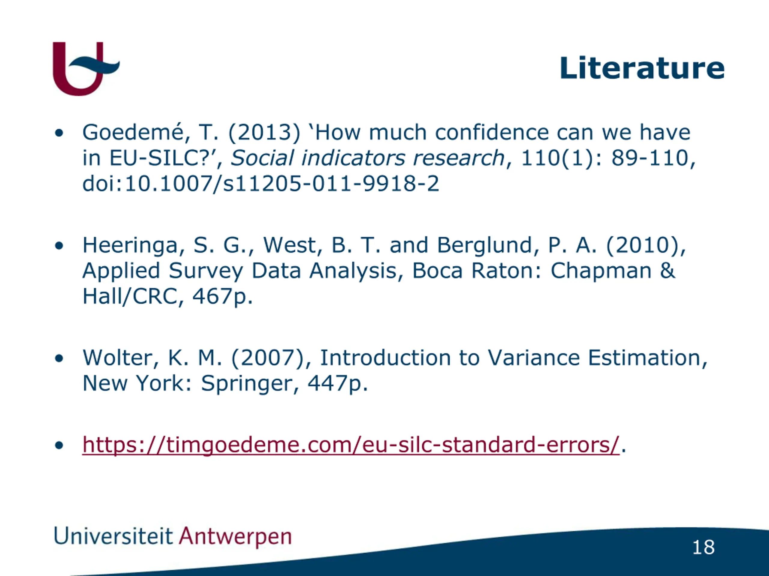Literature Goedem , T. (2013) How much confidence can we have in EU-SILC? , Social indicators research, 110(1): 89-110, doi:10.1007/s11205-011-9918-2 Heeringa, S. G., West, B. T. and Berglund, P. A. (2010), Applied Survey Data Analysis, Boca Raton: Chapman & Hall/CRC, 467p. Wolter, K. M. (2007), Introduction to Variance Estimation, New York: Springer, 447p. https://timgoedeme.com/eu-silc-standard-errors/. 18