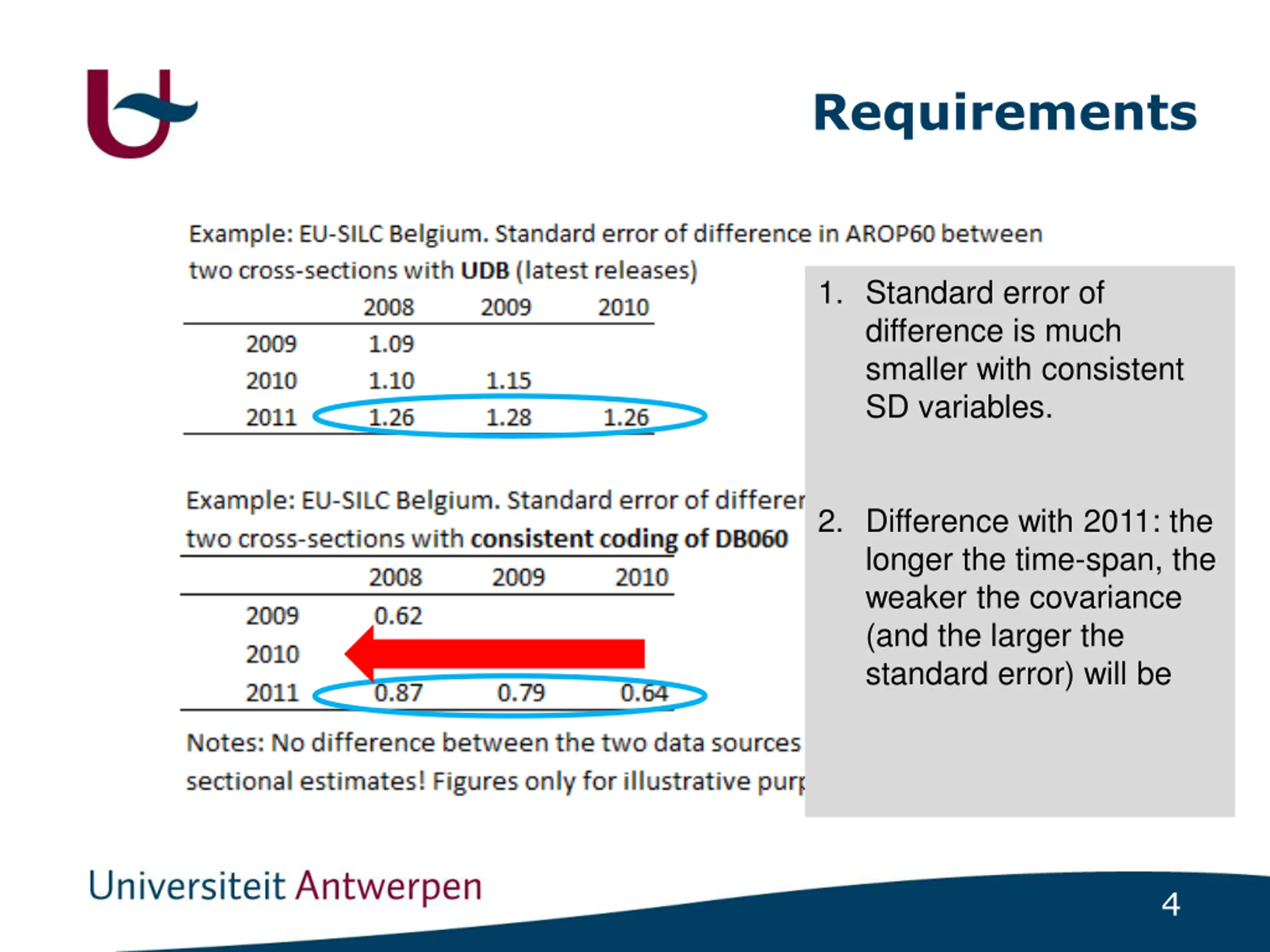 Requirements 1. Standard error of difference is much smaller with consistent SD variables. 2. Difference with 2011: the longer the time-span, the weaker the covariance (and the larger the standard error) will be 4