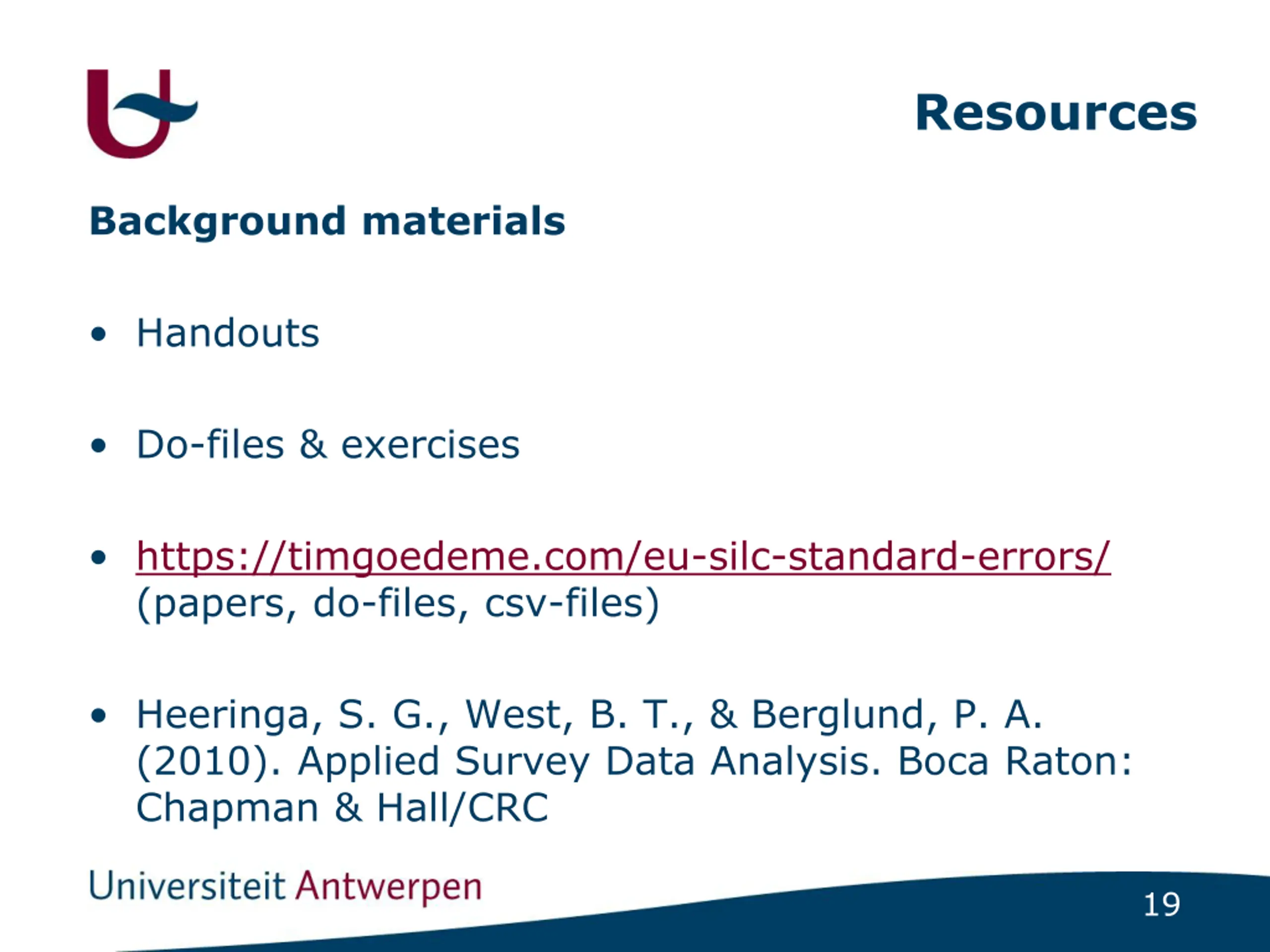 Resources Background materials Handouts Do-files & exercises https://timgoedeme.com/eu-silc-standard-errors/ (papers, do-files, csv-files) Heeringa, S. G., West, B. T., & Berglund, P. A. (2010). Applied Survey Data Analysis. Boca Raton: Chapman & Hall/CRC 19