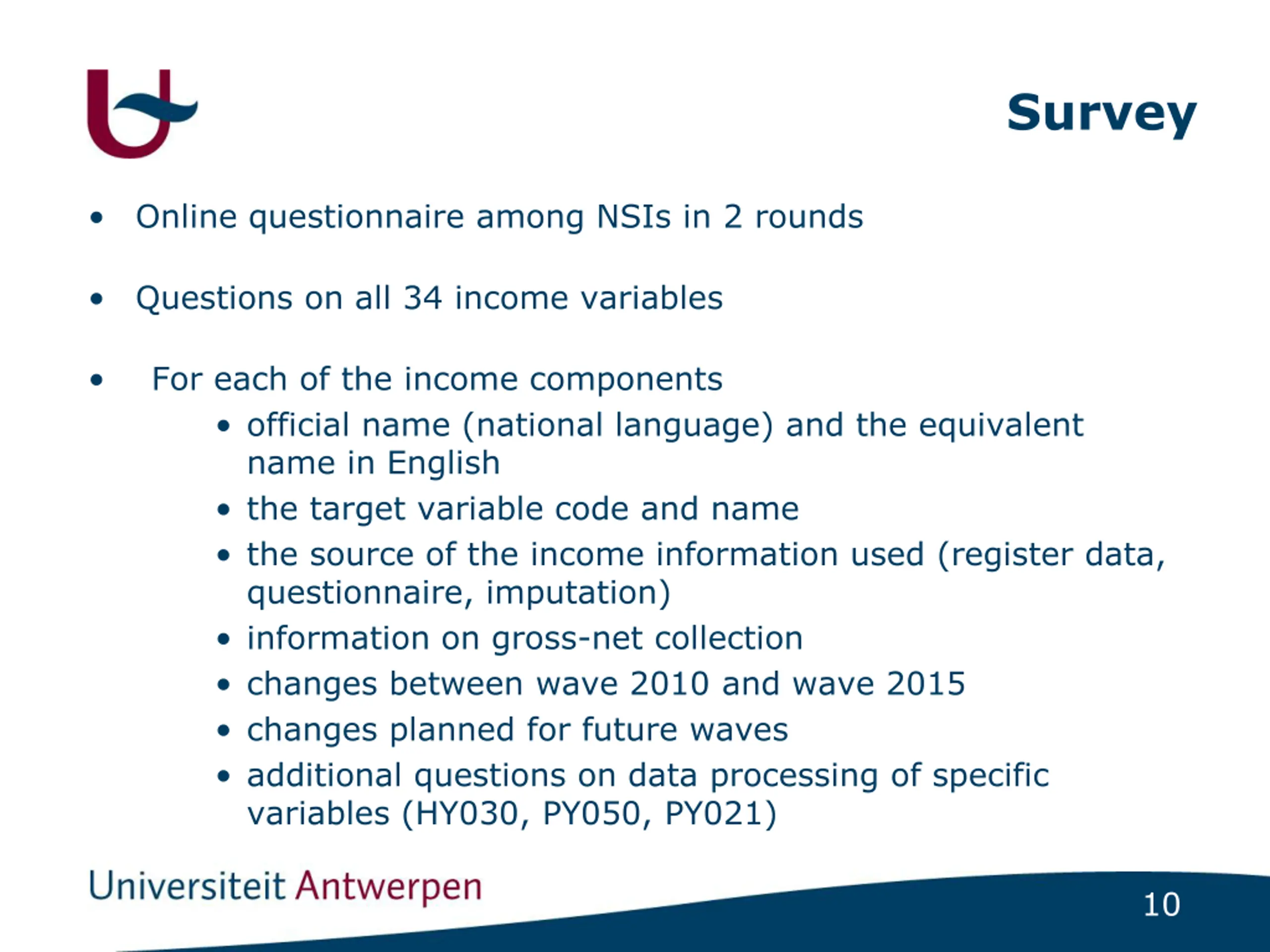 Survey Online questionnaire among NSIs in 2 rounds Questions on all 34 income variables For each of the income components official name (national language) and the equivalent name in English the target variable code and name the source of the income information used (register data, questionnaire, imputation) information on gross-net collection changes between wave 2010 and wave 2015 changes planned for future waves additional questions on data processing of specific variables (HY030, PY050, PY021) 10