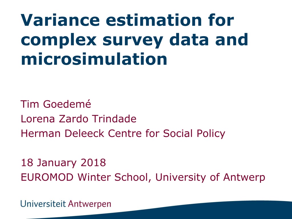 Variance estimation for complex survey data and microsimulation Tim Goedem Lorena Zardo Trindade Herman Deleeck Centre for Social Policy 18 January 2018 EUROMOD Winter School, University of Antwerp