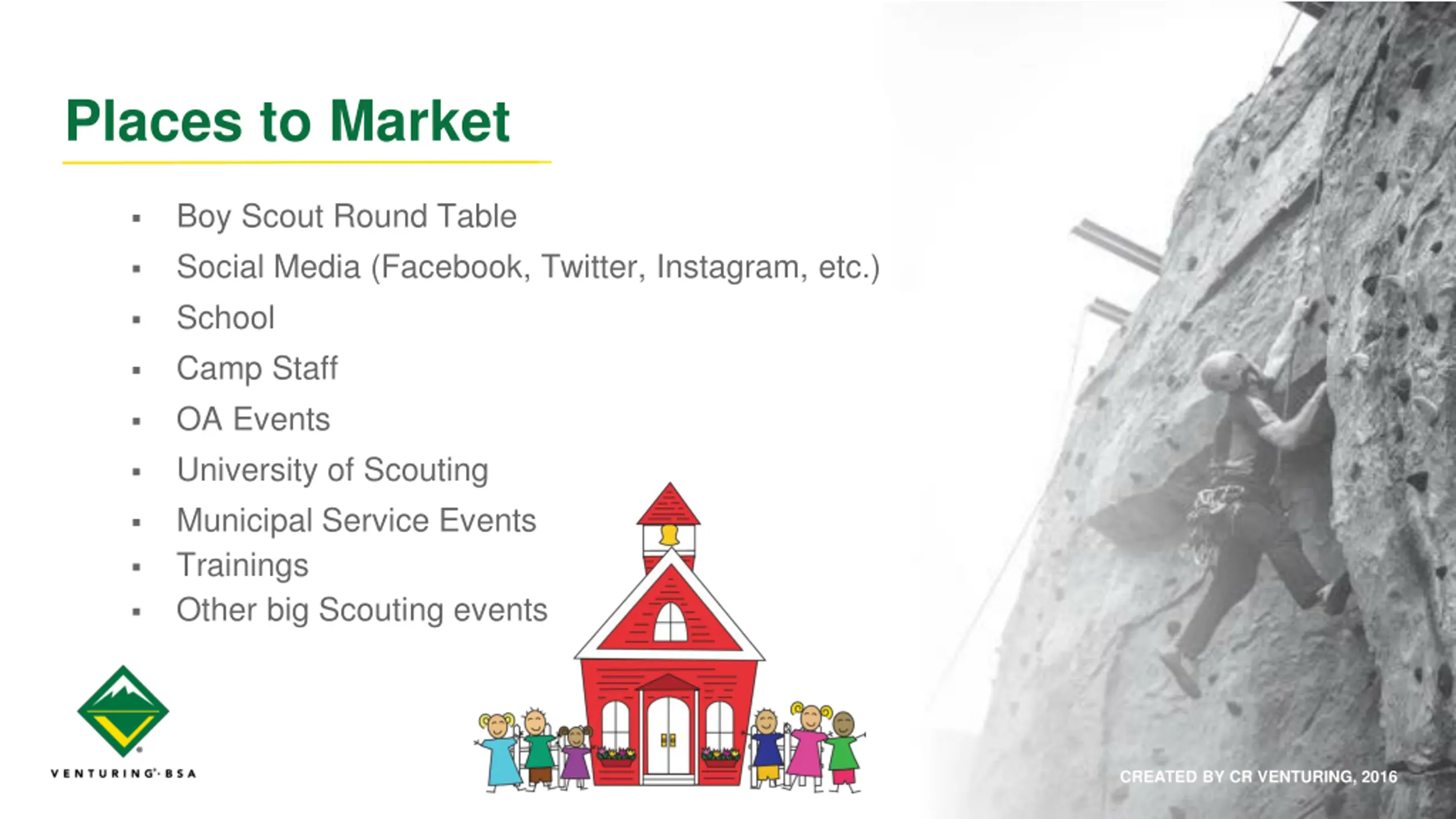 - Places to Market Boy Scout Round Table Social Media (Facebook, Twitter, Instagram, etc.) School Camp Staff OA Events University of Scouting Municipal Service Events Trainings Other big Scouting events CREATED BY CR VENTURING, 2016