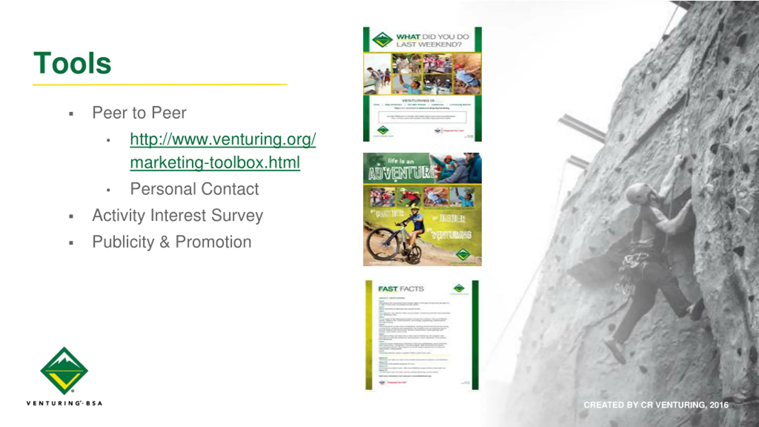 - Further Information Recruiting: http://venturing.org/recruiting.html Marketing: http://www.venturing.org/marketing-toolbox.html Photos: https://scouting.webdamdb.com/bp/#/folder/600592 CREATED BY CR VENTURING, 2016