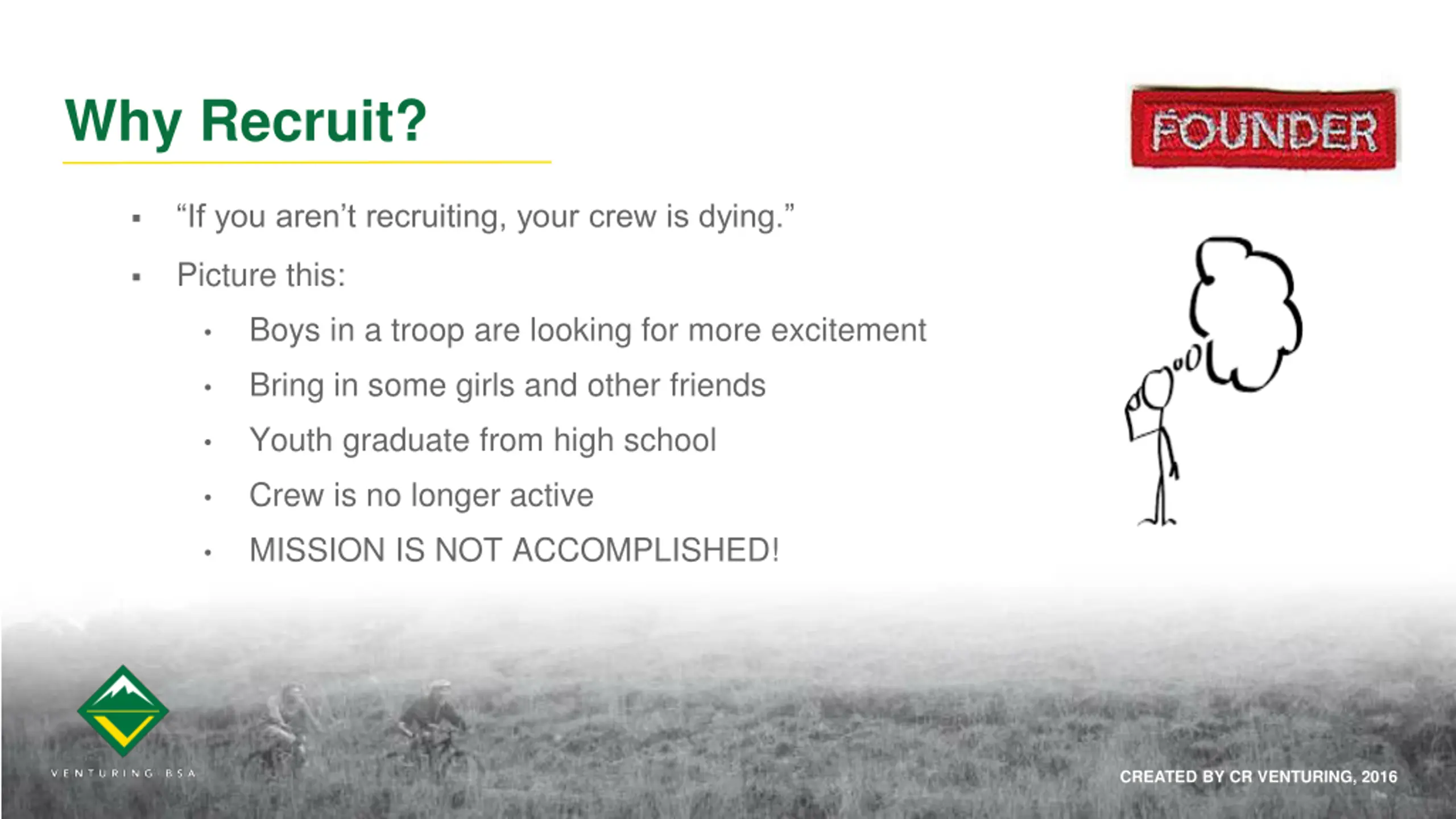 - Why Recruit? If you aren t recruiting, your crew is dying. Picture this: Boys in a troop are looking for more excitement Bring in some girls and other friends Youth graduate from high school Crew is no longer active MISSION IS NOT ACCOMPLISHED! CREATED BY CR VENTURING, 2016