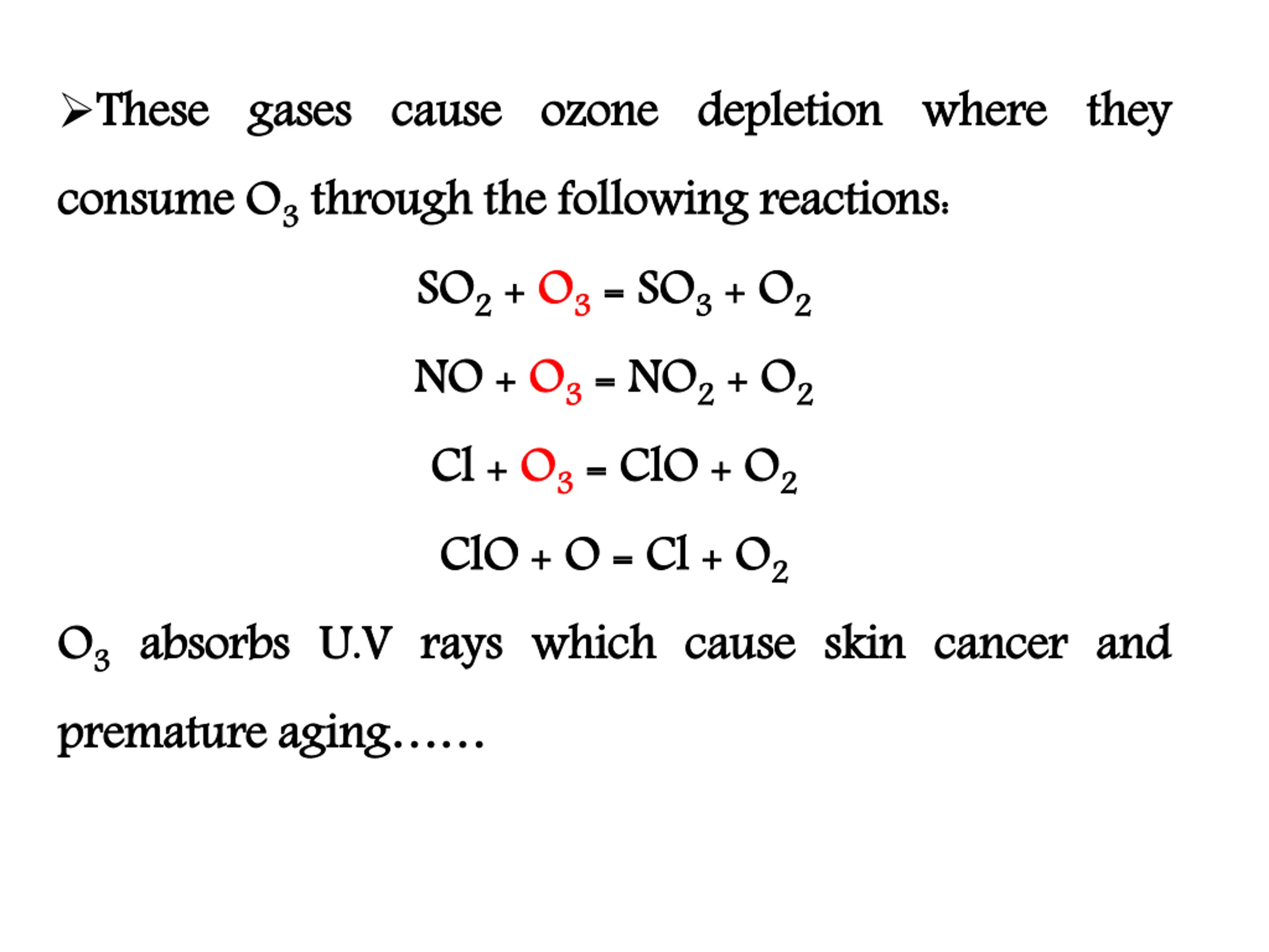 These consume These gases consume O O3 3through gases cause through the cause ozone the following SO NO + Cl Cl + + O O3 3= = ClO ClO rays which aging ozone depletion following reactions SO2 2+ + O O3 3= SO NO + O O3 3= NO ClO + O ClO + O = which cause depletion where reactions: : = SO3 3+ O = NO2 2+ O + O2 2 + O = Cl Cl + O cause skin where they they + O2 2 + O2 2 + O2 2 O O3 3absorbs premature absorbs U U. .V V rays premature aging skin cancer cancer and and