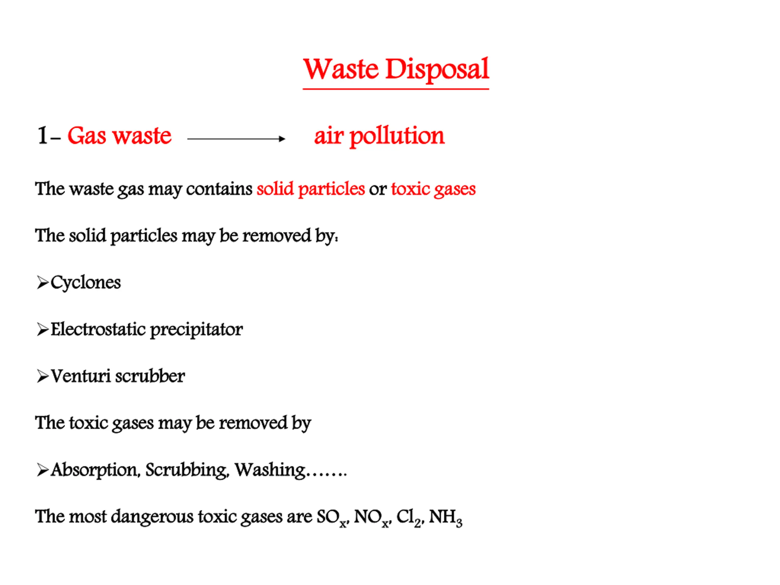 Waste Disposal Waste Disposal 1 1- - Gas waste air pollution Gas waste air pollution The waste gas may contains The waste gas may contains solid particles solid particles or or toxic gases toxic gases The solid particles may be removed by: The solid particles may be removed by: Cyclones Cyclones Electrostatic precipitator Electrostatic precipitator Venturi Venturi scrubber scrubber The toxic gases may be removed by The toxic gases may be removed by Absorption, Scrubbing, Washing . Absorption, Scrubbing, Washing . The most dangerous toxic gases are The most dangerous toxic gases are SO SOx x, NO , NOx x, Cl , Cl2 2, NH , NH3 3