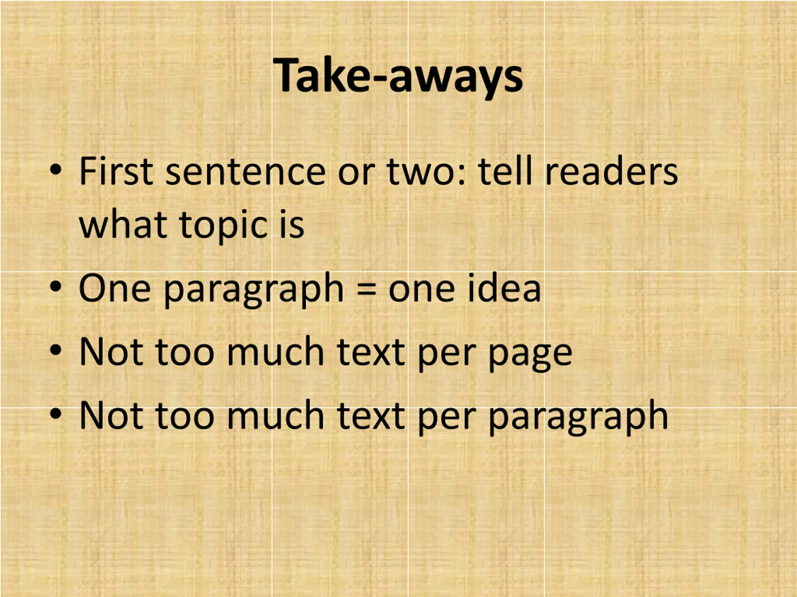 Take-aways First sentence or two: tell readers what topic is One paragraph = one idea Not too much text per page Not too much text per paragraph
