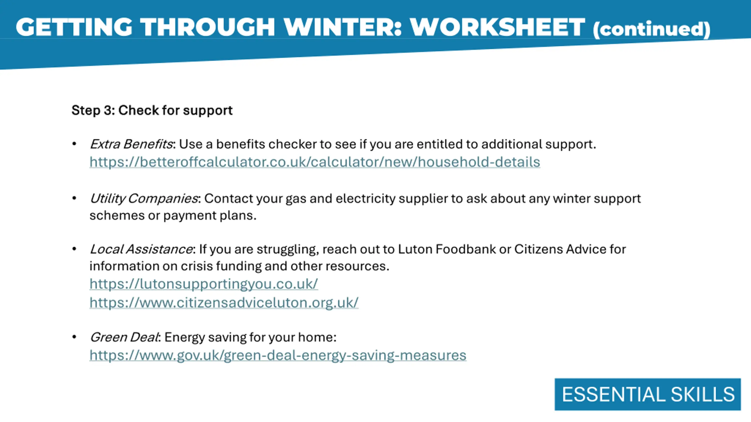 GETTING THROUGH WINTER: WORKSHEET (continued) Step 3: Check for support Step 3: Check for support Extra Benefits: Use a benefits checker to see if you are entitled to additional support. https://betteroffcalculator.co.uk/calculator/new/household-details Utility Companies: Contact your gas and electricity supplier to ask about any winter support schemes or payment plans. Local Assistance: If you are struggling, reach out to Luton Foodbank or Citizens Advice for information on crisis funding and other resources. https://lutonsupportingyou.co.uk/ https://www.citizensadviceluton.org.uk/ Green Deal: Energy saving for your home: https://www.gov.uk/green-deal-energy-saving-measures ESSENTIAL SKILLS