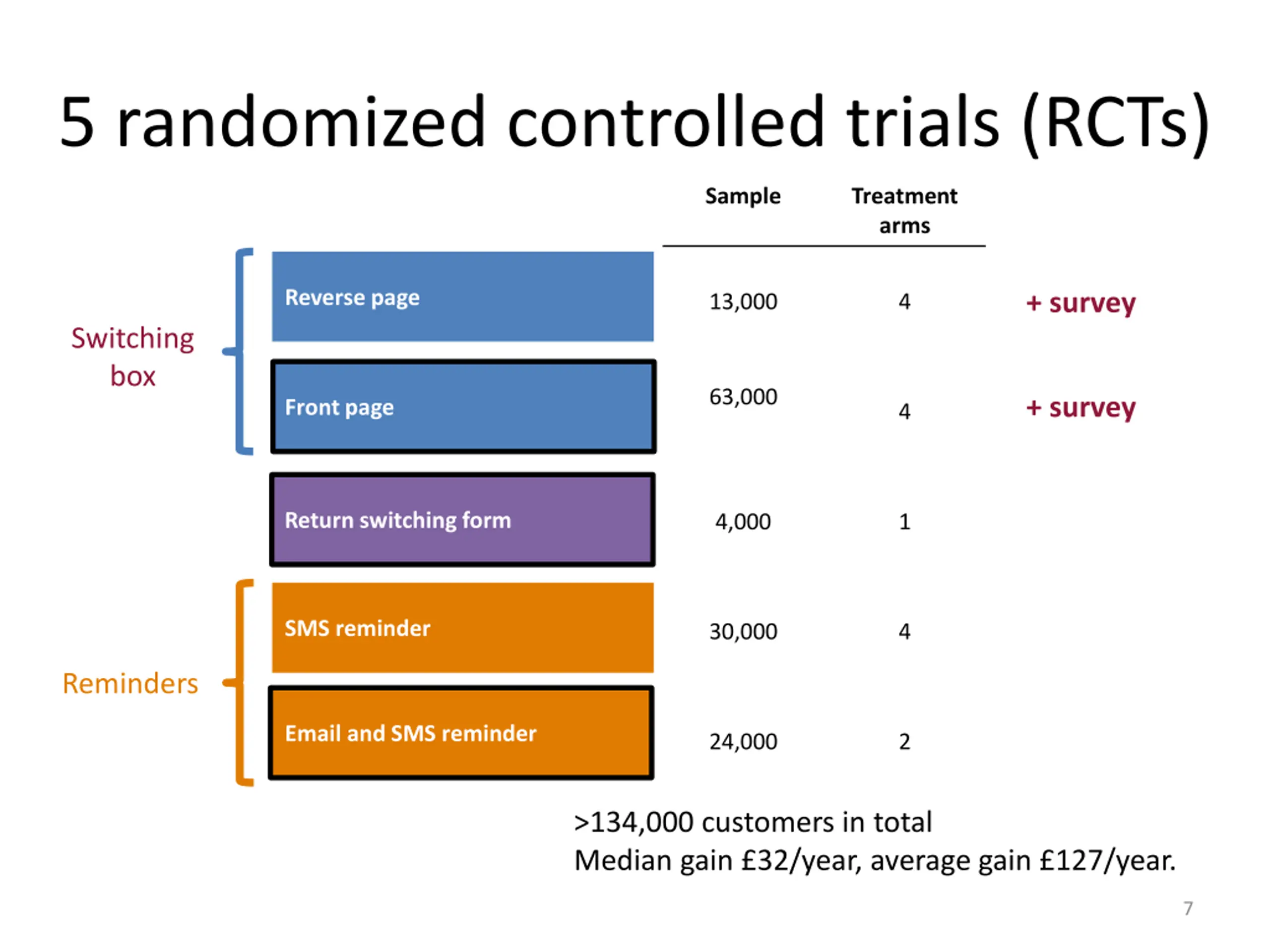 5 randomized controlled trials (RCTs) Sample Treatment arms Reverse page + survey 13,000 4 Switching box 63,000 + survey Front page 4 Return switching form 4,000 1 SMS reminder 30,000 4 Reminders Email and SMS reminder 24,000 2 >134,000 customers in total Median gain 32/year, average gain 127/year. 7
