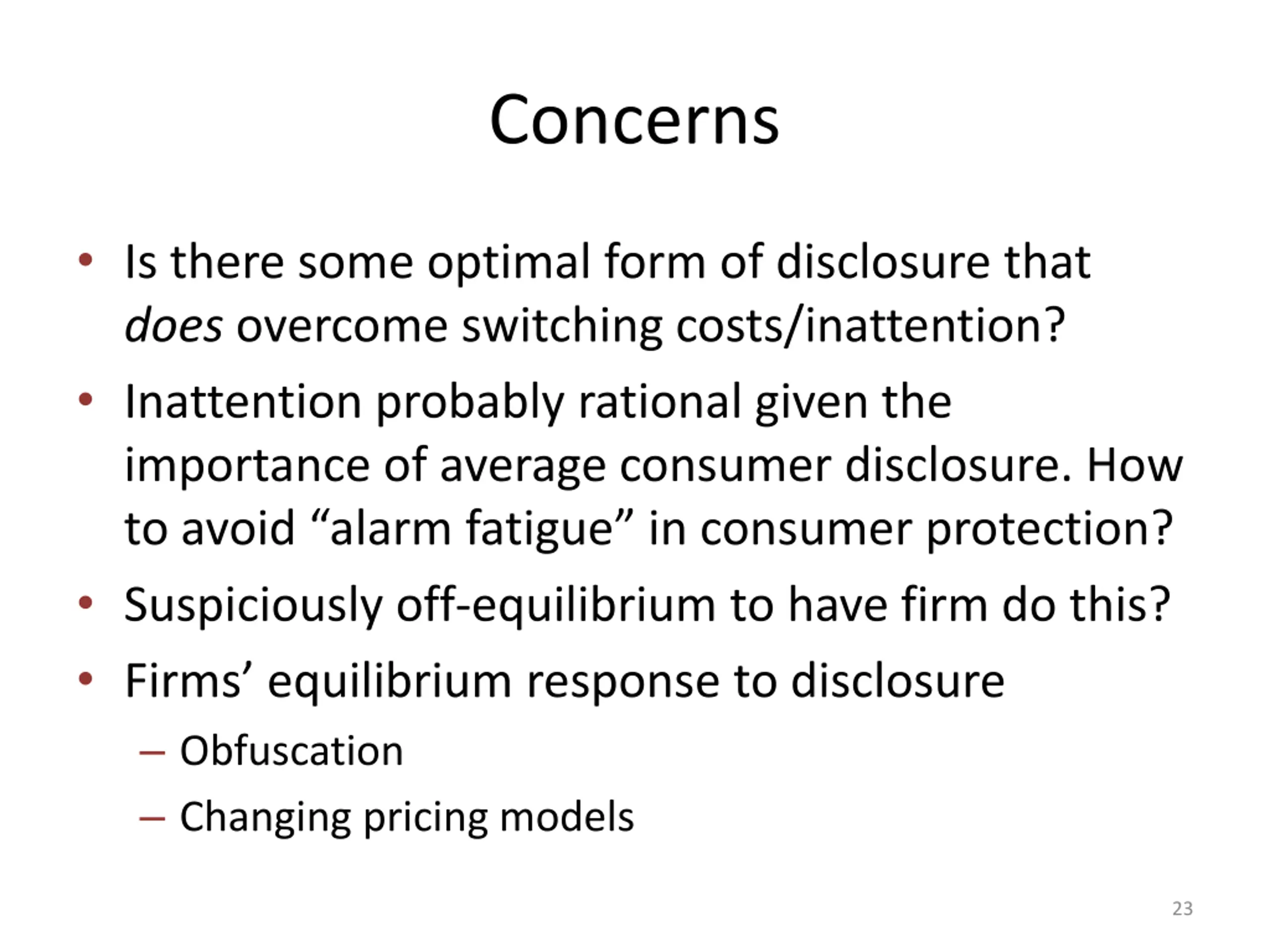 Concerns Is there some optimal form of disclosure that does overcome switching costs/inattention? Inattention probably rational given the importance of average consumer disclosure. How to avoid alarm fatigue in consumer protection? Suspiciously off-equilibrium to have firm do this? Firms equilibrium response to disclosure Obfuscation Changing pricing models 23