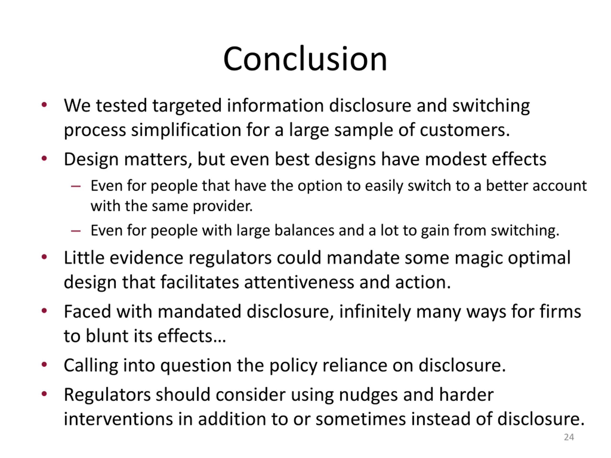 Conclusion We tested targeted information disclosure and switching process simplification for a large sample of customers. Design matters, but even best designs have modest effects Even for people that have the option to easily switch to a better account with the same provider. Even for people with large balances and a lot to gain from switching. Little evidence regulators could mandate some magic optimal design that facilitates attentiveness and action. Faced with mandated disclosure, infinitely many ways for firms to blunt its effects Calling into question the policy reliance on disclosure. Regulators should consider using nudges and harder interventions in addition to or sometimes instead of disclosure. 24