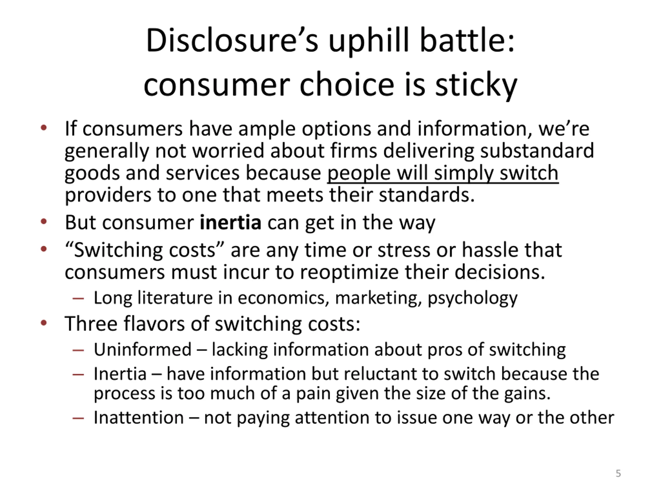 Disclosures uphill battle: consumer choice is sticky If consumers have ample options and information, we re generally not worried about firms delivering substandard goods and services because people will simply switch providers to one that meets their standards. But consumer inertia can get in the way Switching costs are any time or stress or hassle that consumers must incur to reoptimize their decisions. Long literature in economics, marketing, psychology Three flavors of switching costs: Uninformed lacking information about pros of switching Inertia have information but reluctant to switch because the process is too much of a pain given the size of the gains. Inattention not paying attention to issue one way or the other 5