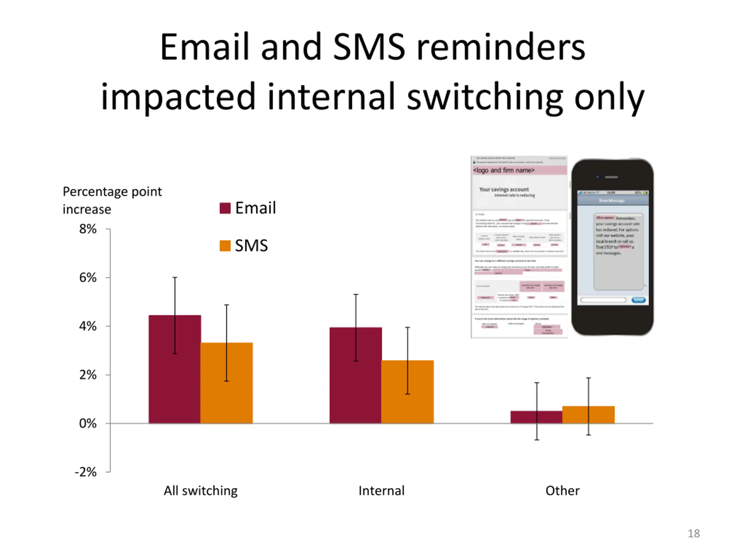 Email and SMS reminders impacted internal switching only Percentage point increase Email 8% SMS 6% 4% 2% 0% -2% All switching Internal Other 18