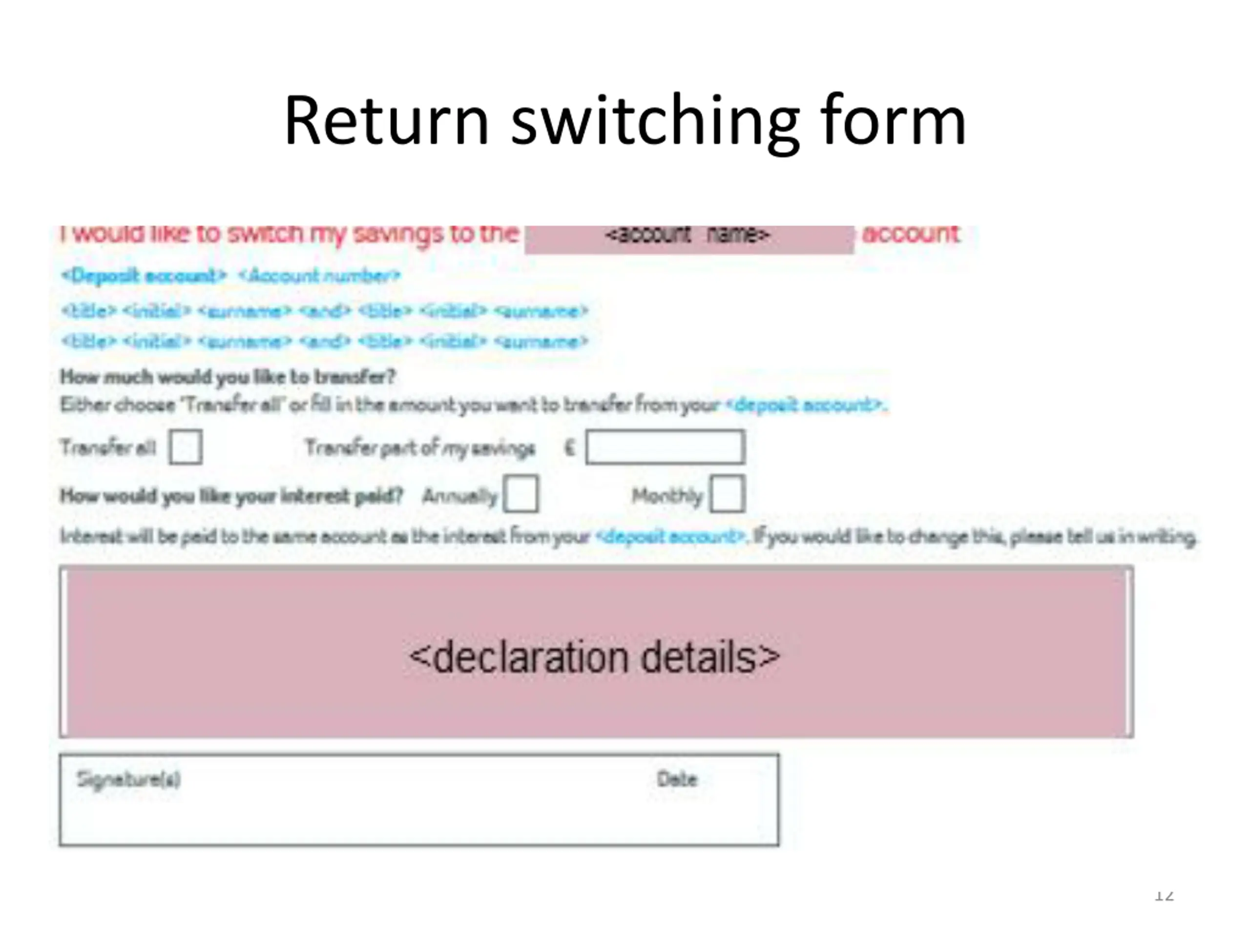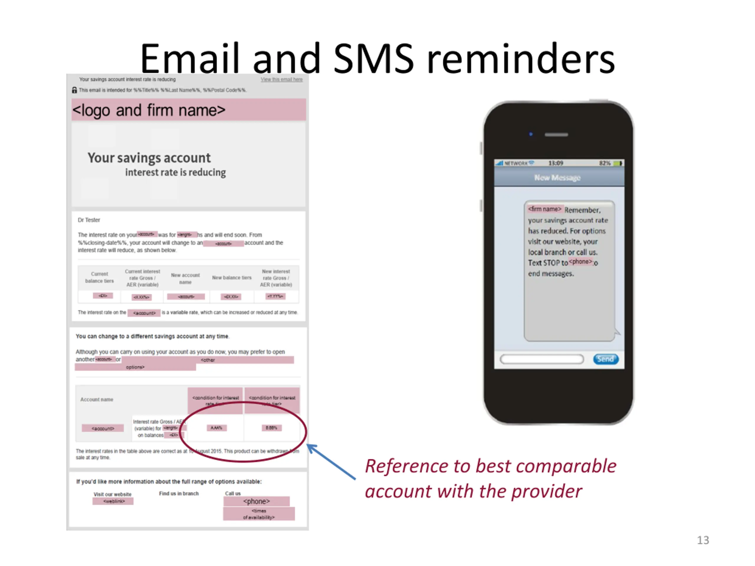 Email and SMS reminders Reference to best comparable account with the provider 13