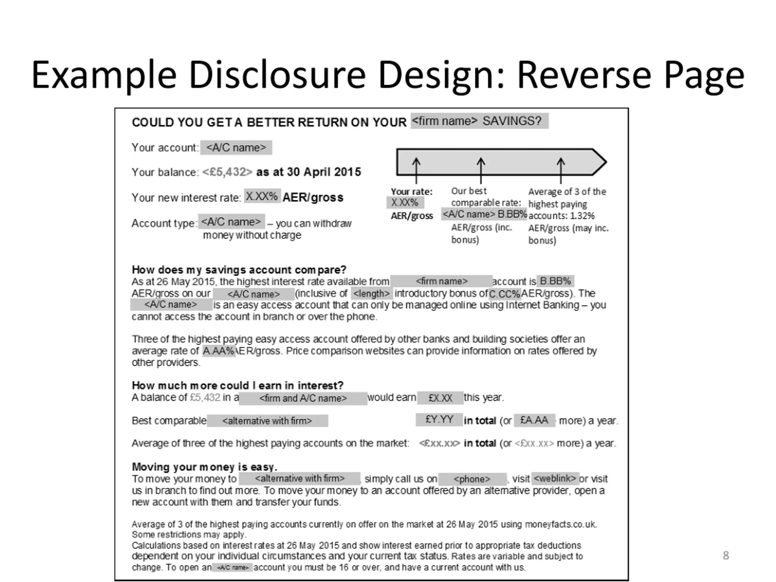 Testing the Effectiveness of Consumer Financial Disclosure: Experimental Evidence From Savings Accounts CFPB Research Conference December 2016 Paul Adams Stefan Hunt Redis Zaliauskas Financial Conduct Authority Christopher Palmer UC Berkeley 1 The views expressed herein do not necessarily represent the official position of the FCA.