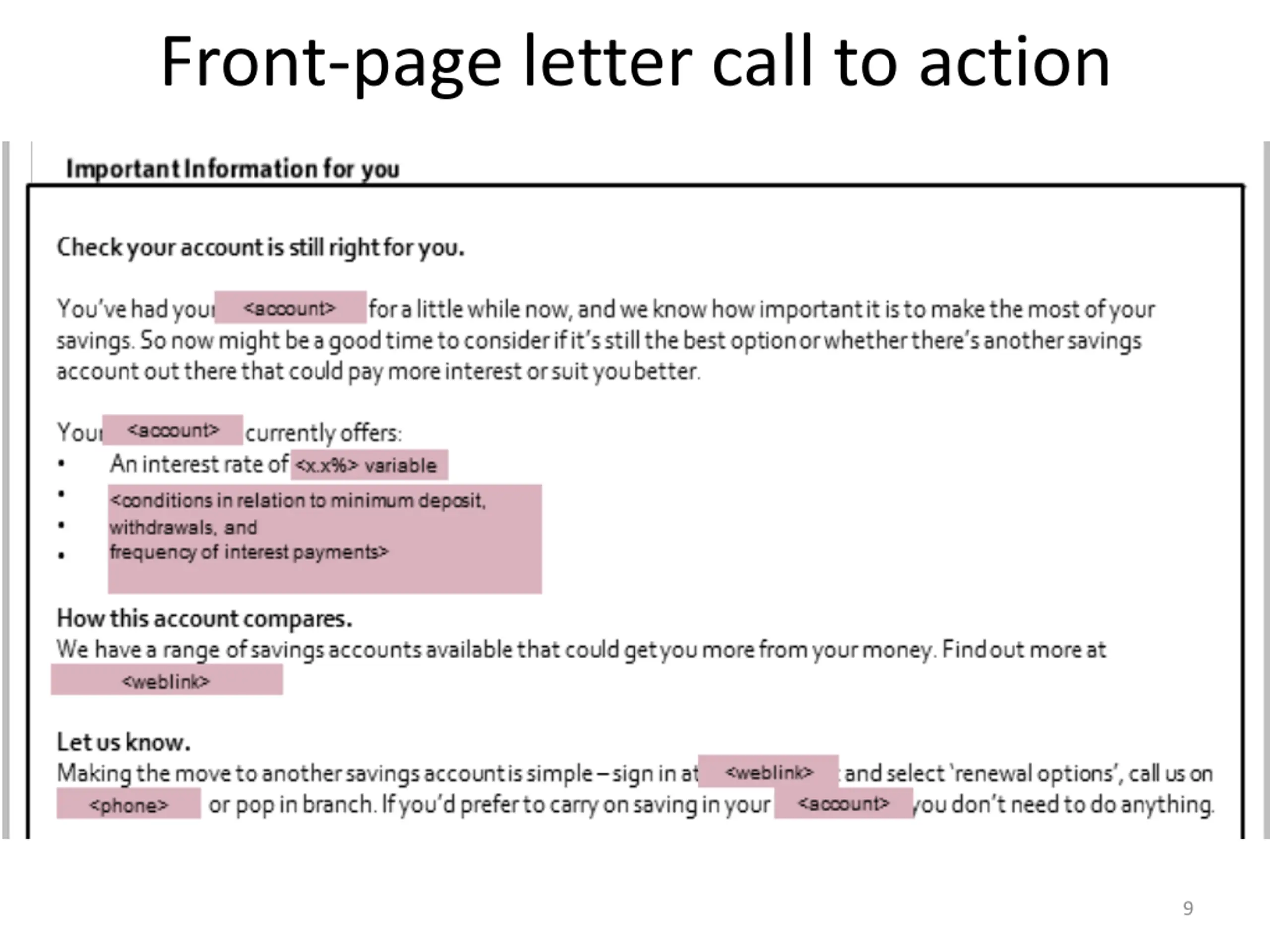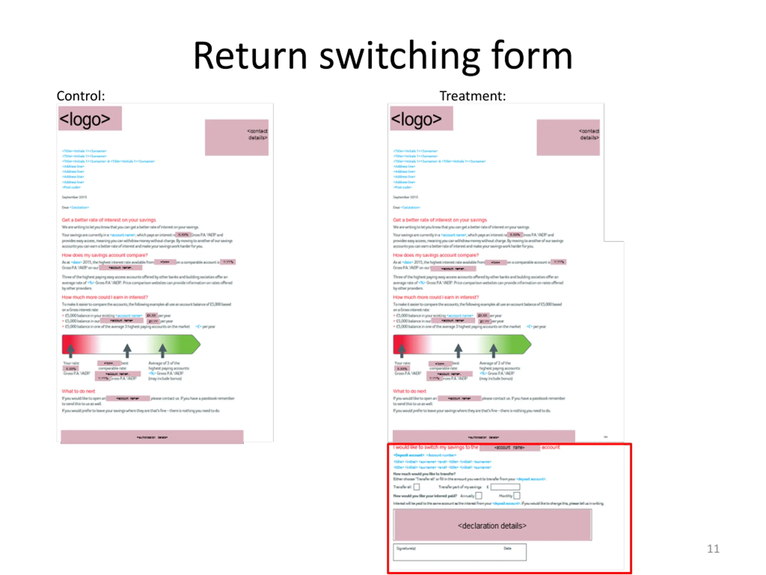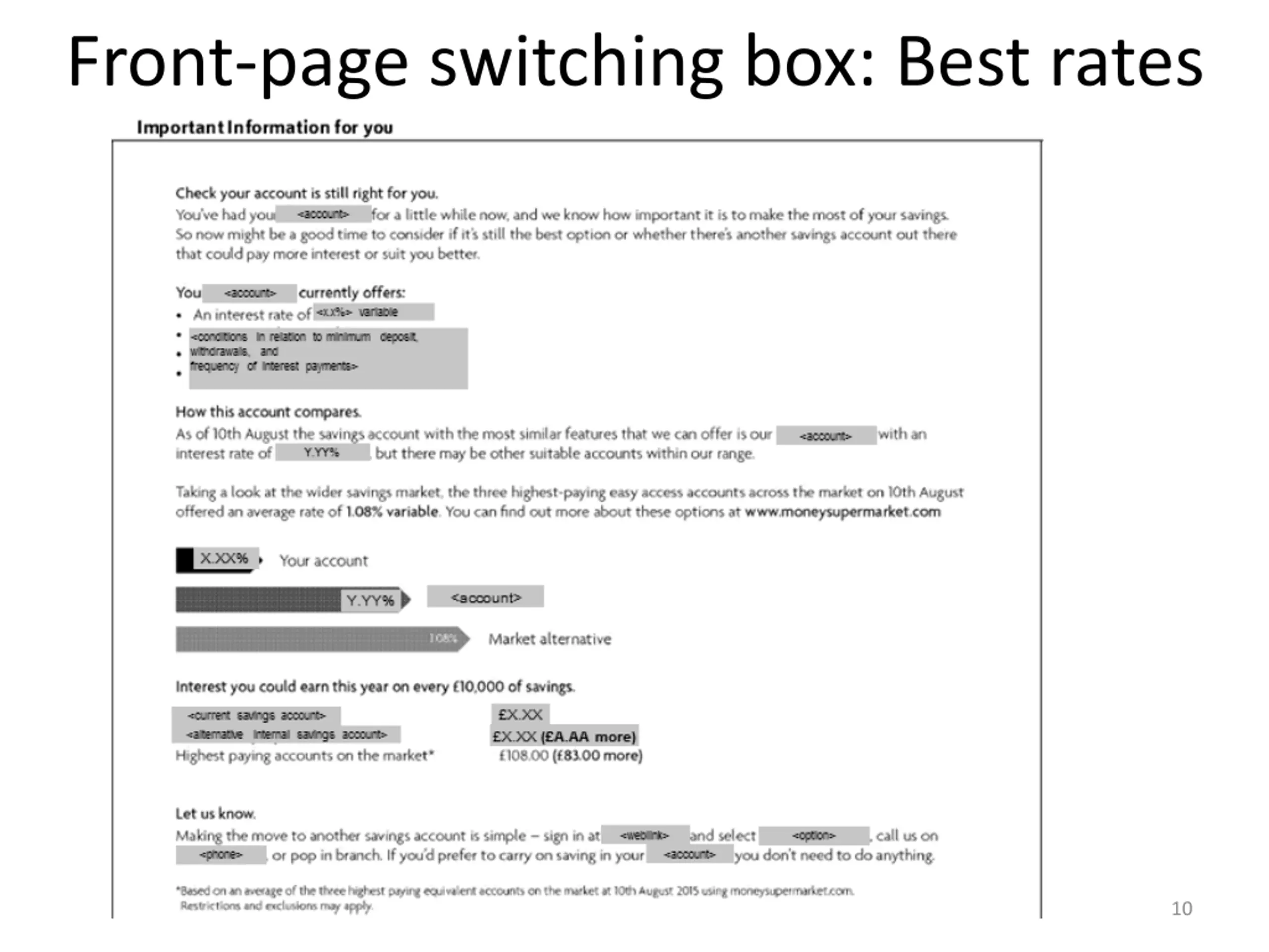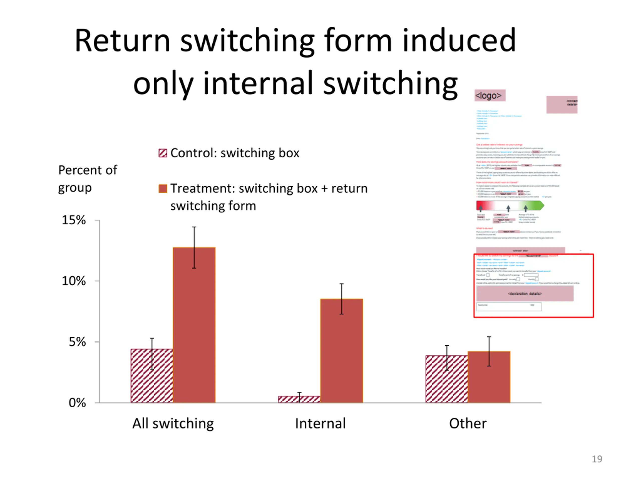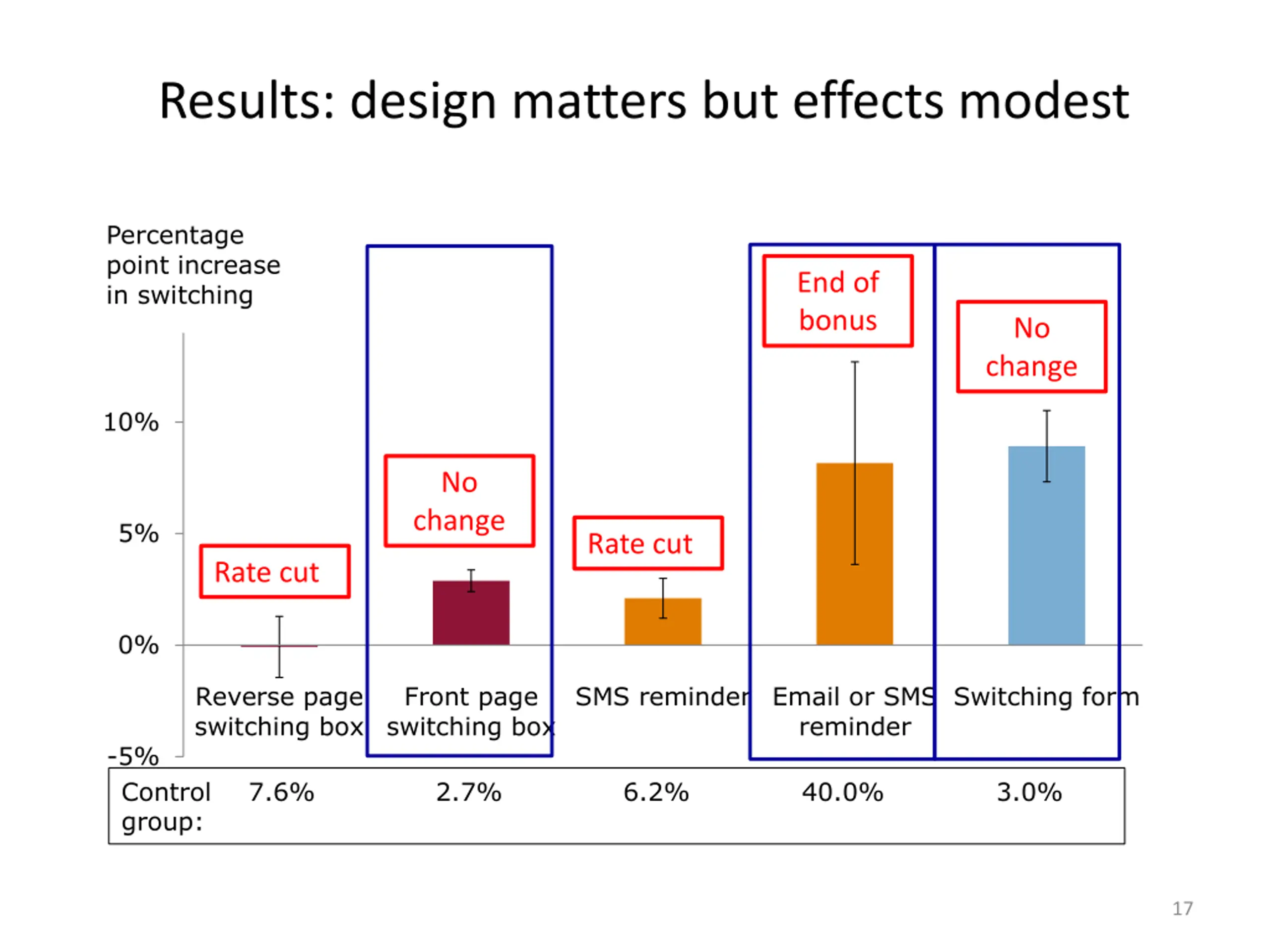 Results: design matters but effects modest Percentage point increase in switching End of bonus No change 10% No change 5% Rate cut Rate cut 0% Reverse page switching box Front page switching box SMS reminder Email or SMS Switching form reminder -5% Control group: 7.6% 2.7% 6.2% 40.0% 3.0% 17