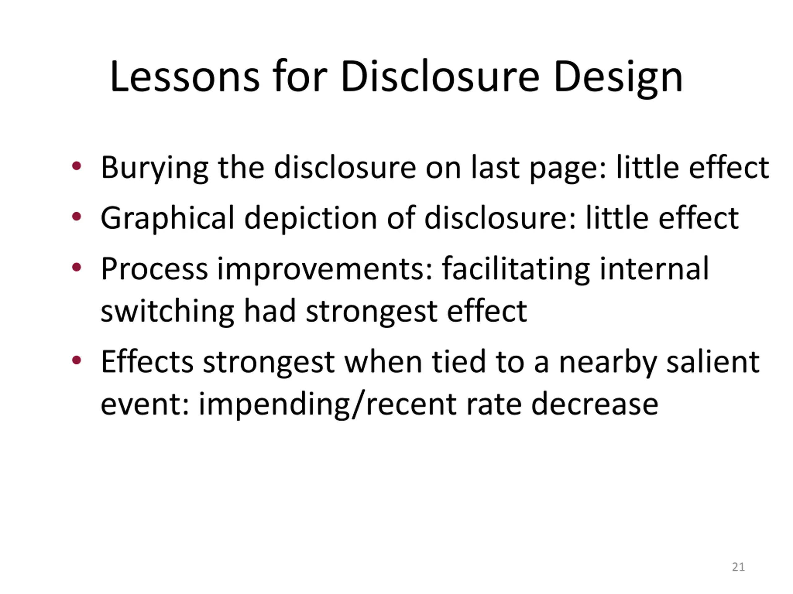 Lessons for Disclosure Design Burying the disclosure on last page: little effect Graphical depiction of disclosure: little effect Process improvements: facilitating internal switching had strongest effect Effects strongest when tied to a nearby salient event: impending/recent rate decrease 21