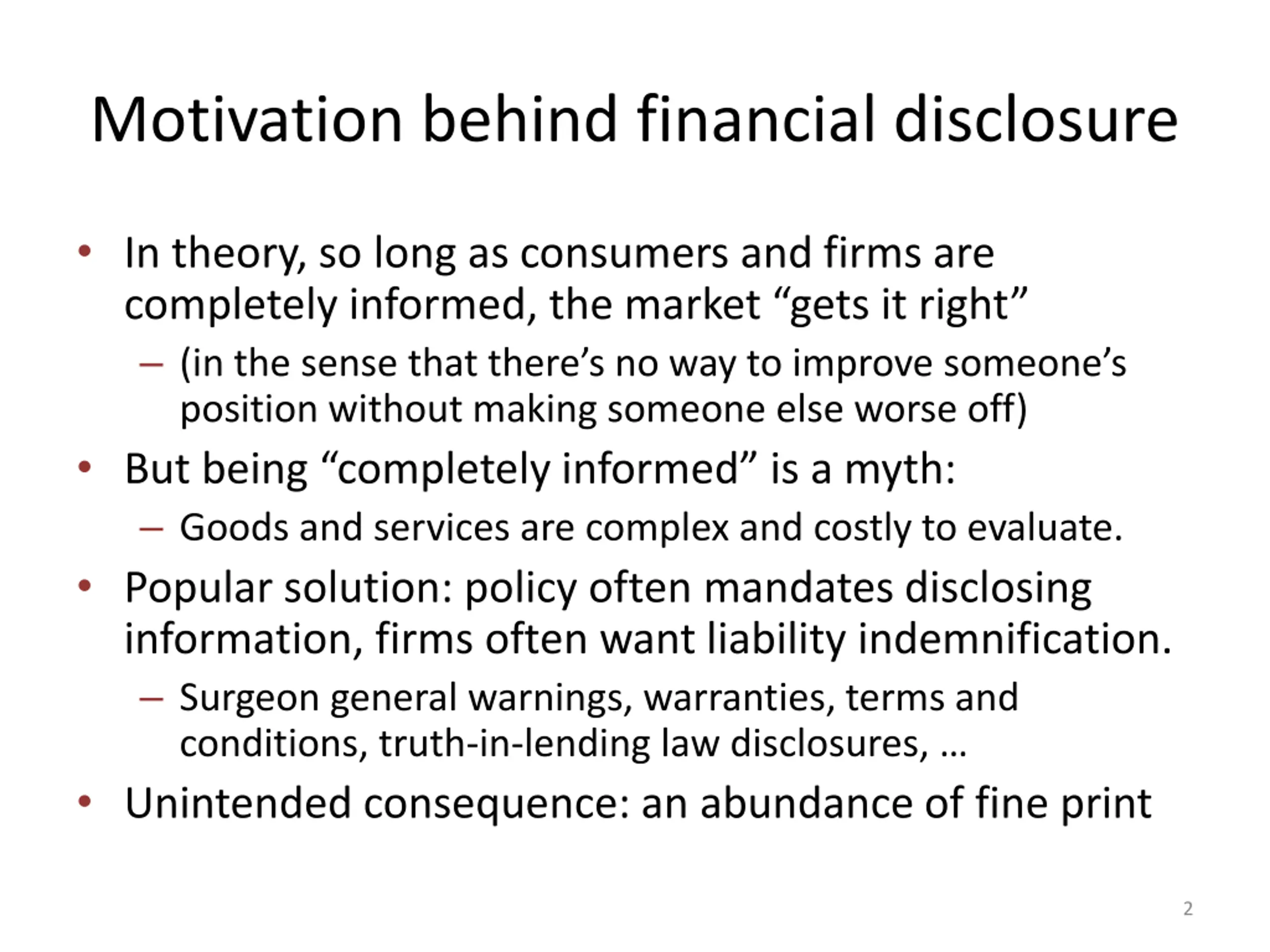 Motivation behind financial disclosure In theory, so long as consumers and firms are completely informed, the market gets it right (in the sense that there s no way to improve someone s position without making someone else worse off) But being completely informed is a myth: Goods and services are complex and costly to evaluate. Popular solution: policy often mandates disclosing information, firms often want liability indemnification. Surgeon general warnings, warranties, terms and conditions, truth-in-lending law disclosures, Unintended consequence: an abundance of fine print 2