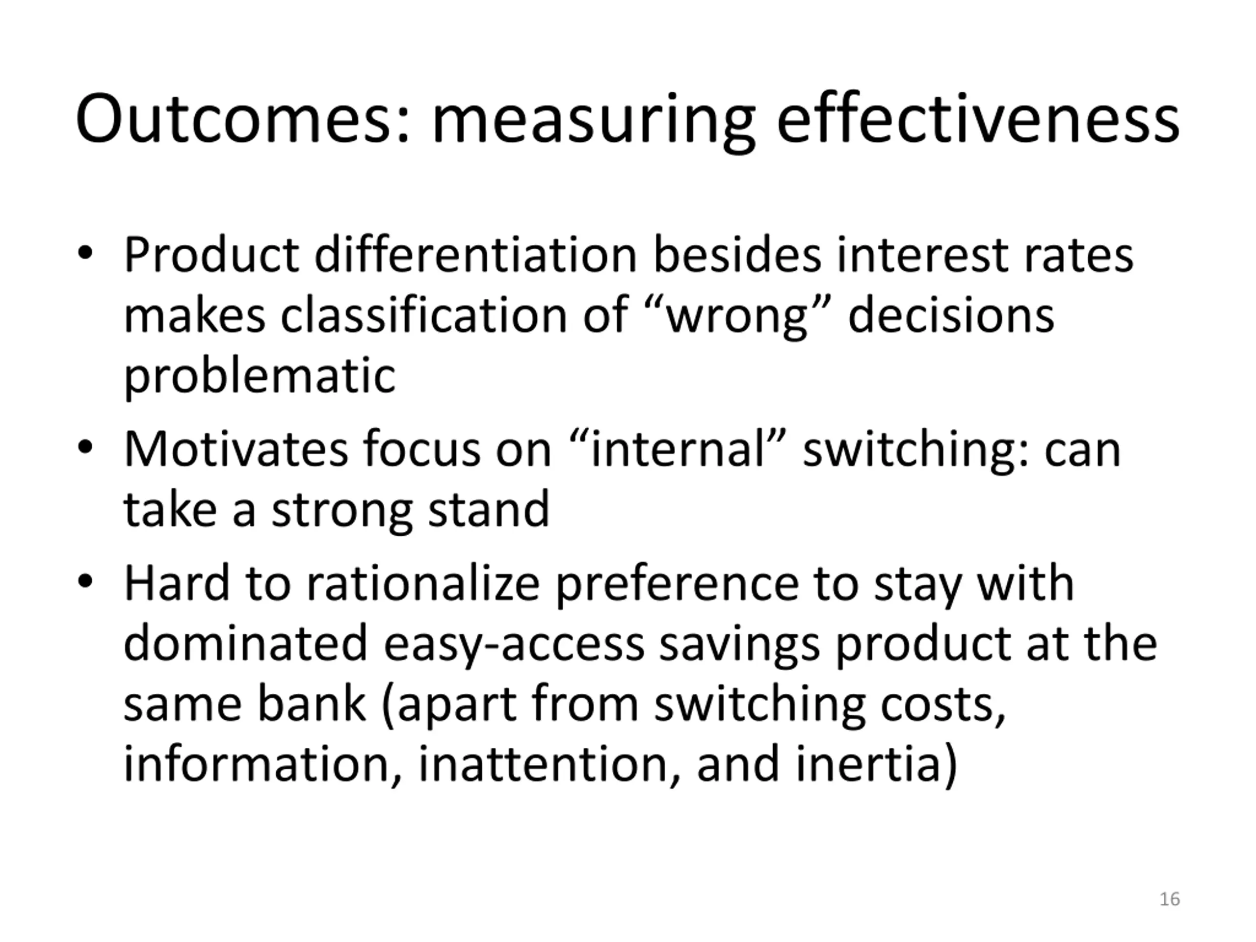 Outcomes: measuring effectiveness Product differentiation besides interest rates makes classification of wrong decisions problematic Motivates focus on internal switching: can take a strong stand Hard to rationalize preference to stay with dominated easy-access savings product at the same bank (apart from switching costs, information, inattention, and inertia) 16
