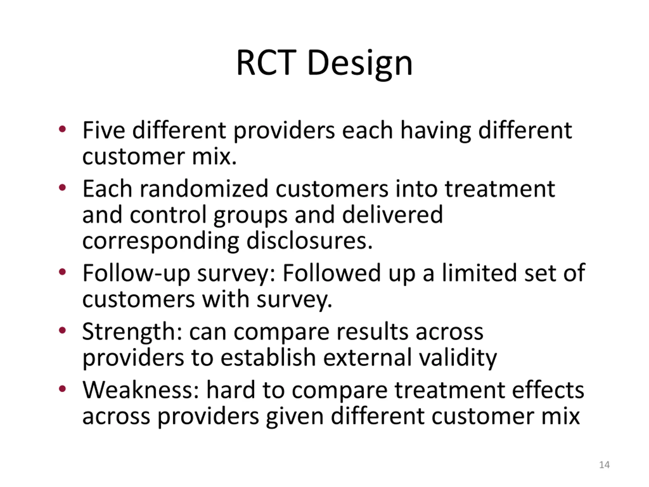 RCT Design Five different providers each having different customer mix. Each randomized customers into treatment and control groups and delivered corresponding disclosures. Follow-up survey: Followed up a limited set of customers with survey. Strength: can compare results across providers to establish external validity Weakness: hard to compare treatment effects across providers given different customer mix 14
