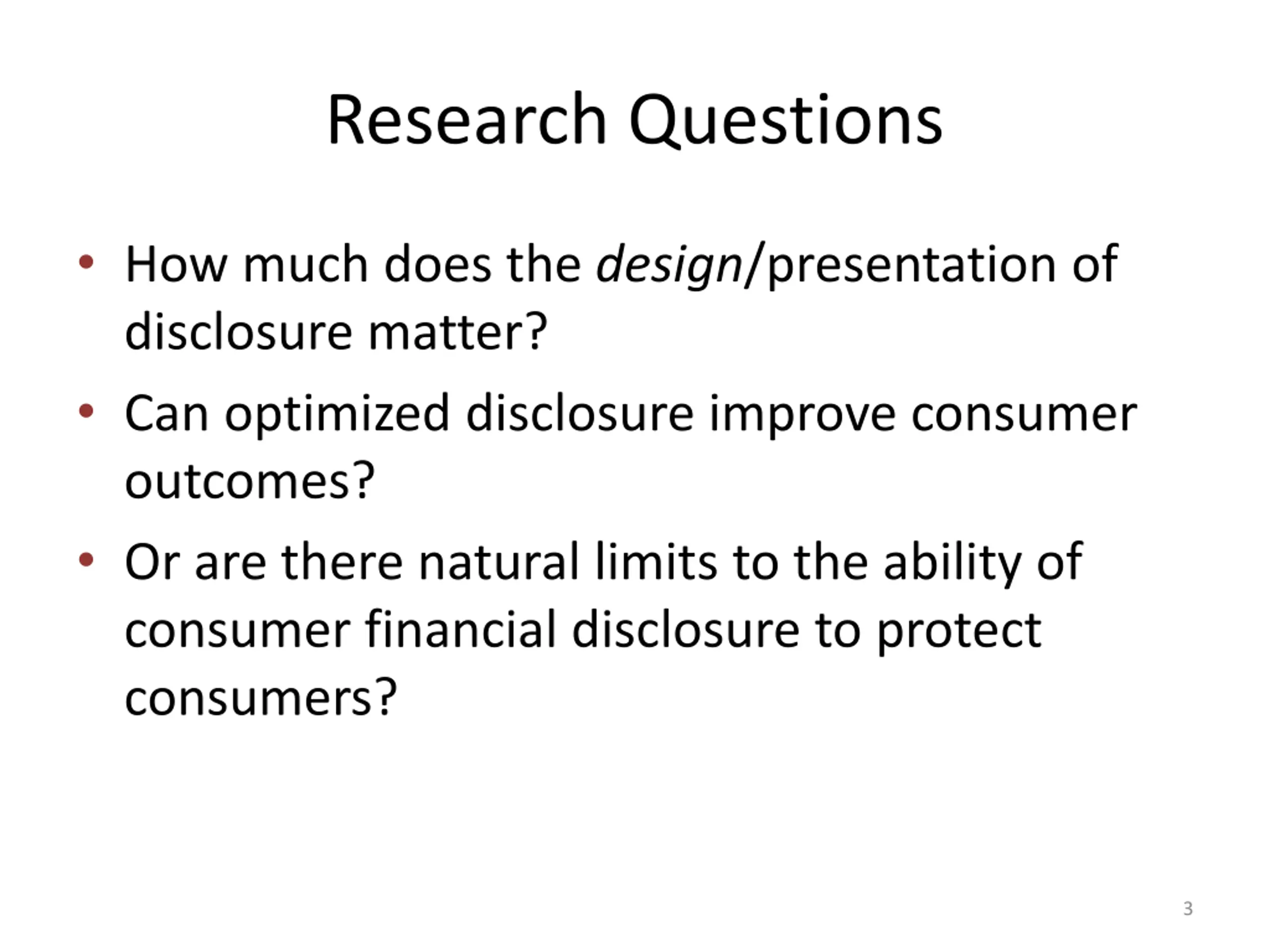 Research Questions How much does the design/presentation of disclosure matter? Can optimized disclosure improve consumer outcomes? Or are there natural limits to the ability of consumer financial disclosure to protect consumers? 3