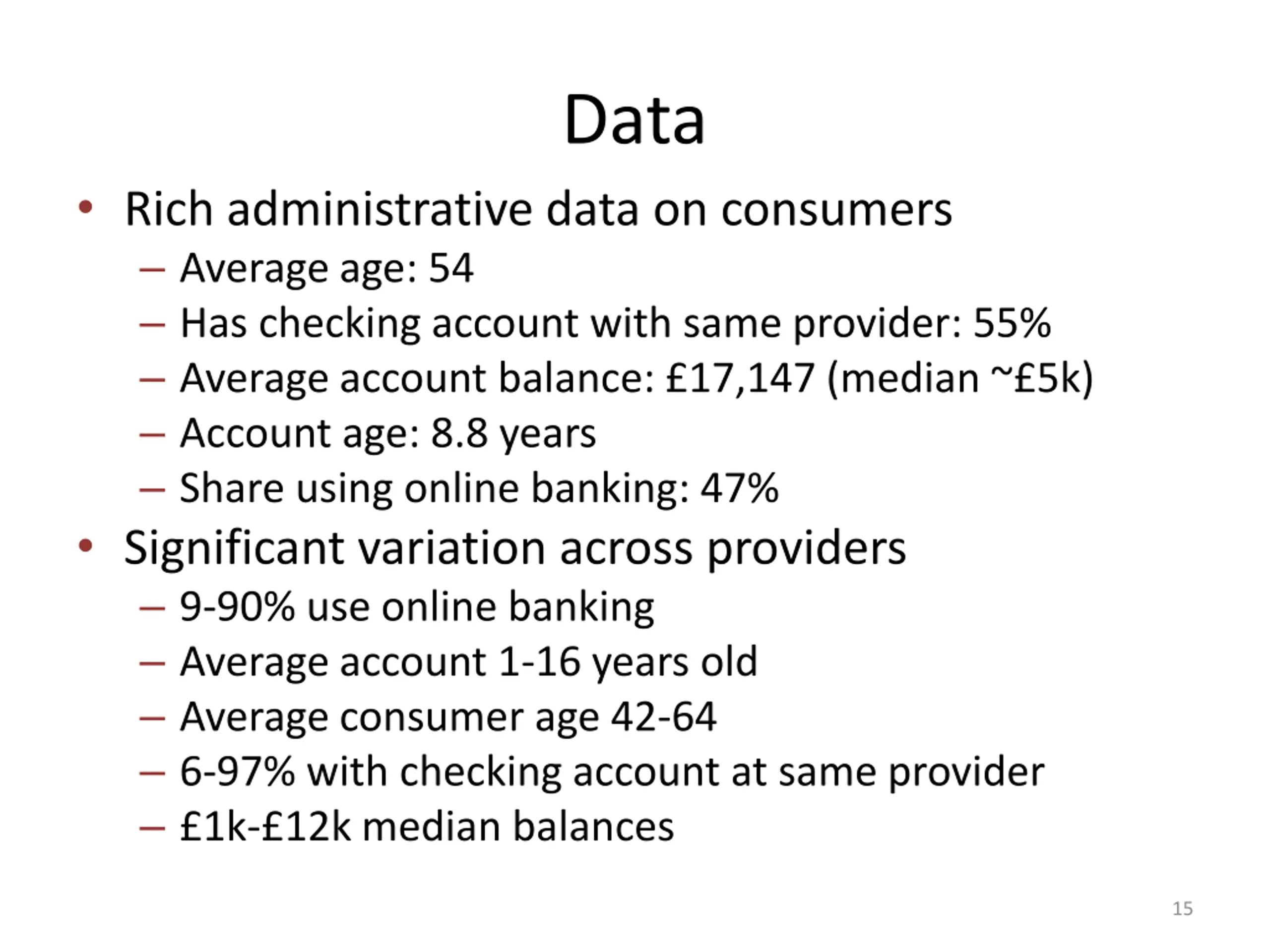 Data Rich administrative data on consumers Average age: 54 Has checking account with same provider: 55% Average account balance: 17,147 (median ~ 5k) Account age: 8.8 years Share using online banking: 47% Significant variation across providers 9-90% use online banking Average account 1-16 years old Average consumer age 42-64 6-97% with checking account at same provider 1k- 12k median balances 15