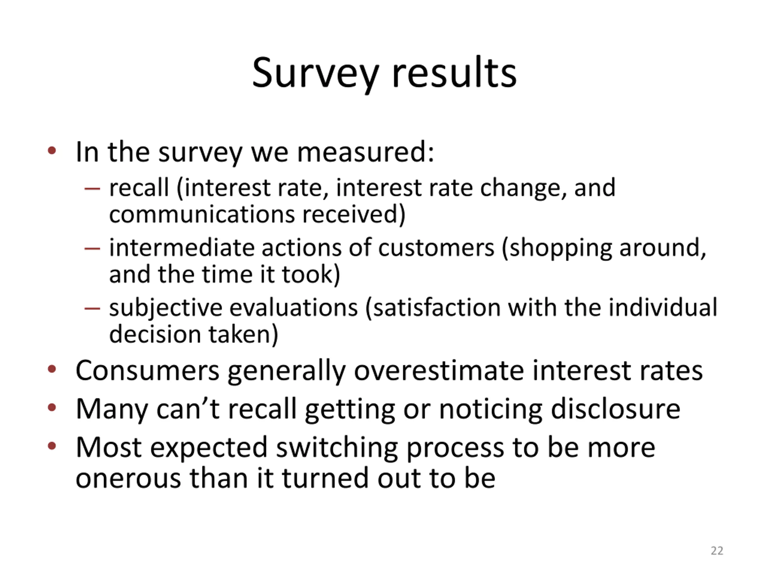 Survey results In the survey we measured: recall (interest rate, interest rate change, and communications received) intermediate actions of customers (shopping around, and the time it took) subjective evaluations (satisfaction with the individual decision taken) Consumers generally overestimate interest rates Many can t recall getting or noticing disclosure Most expected switching process to be more onerous than it turned out to be 22