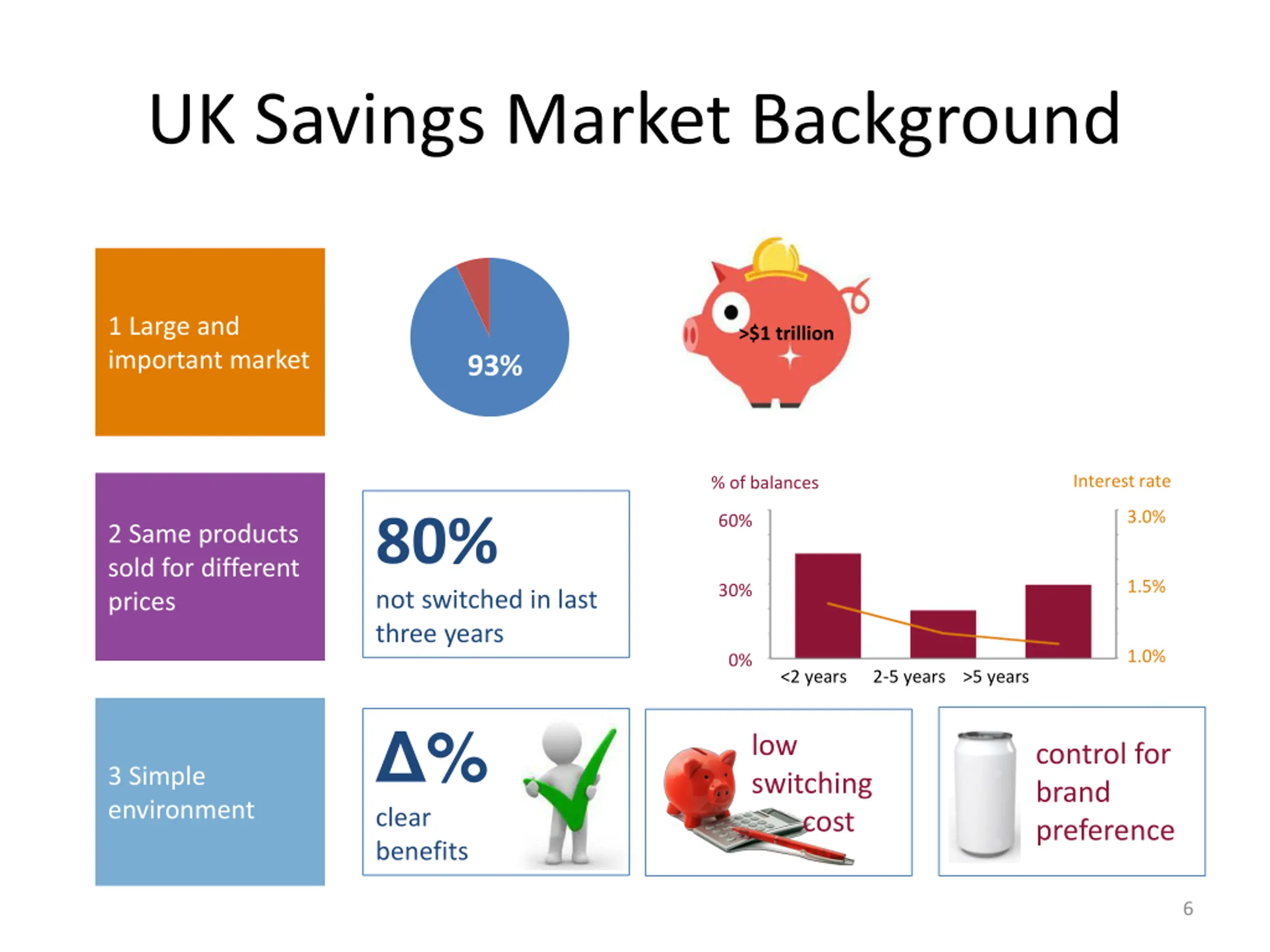 UK Savings Market Background 1 Large and important market >$1 trillion 93% Interest rate % of balances 3.0% 80% not switched in last three years 60% 2 Same products sold for different prices 1.5% 30% 1.0% 0% <2 years 2-5 years >5 years Image result for benefits % clear benefits Image result for costs low switching cost control for brand preference 3 Simple environment 6