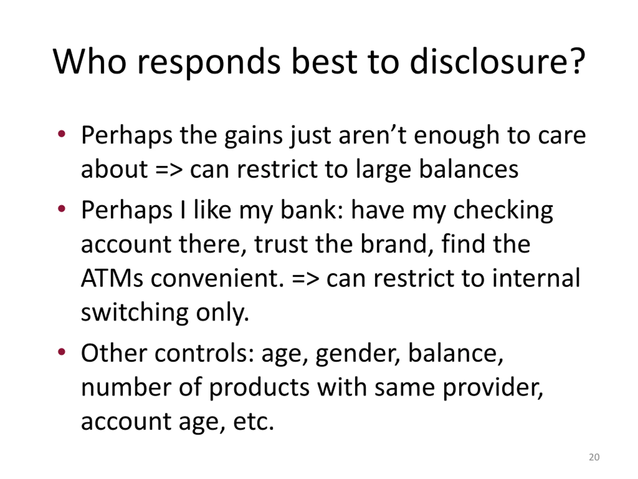 Who responds best to disclosure? Perhaps the gains just aren t enough to care about => can restrict to large balances Perhaps I like my bank: have my checking account there, trust the brand, find the ATMs convenient. => can restrict to internal switching only. Other controls: age, gender, balance, number of products with same provider, account age, etc. 20