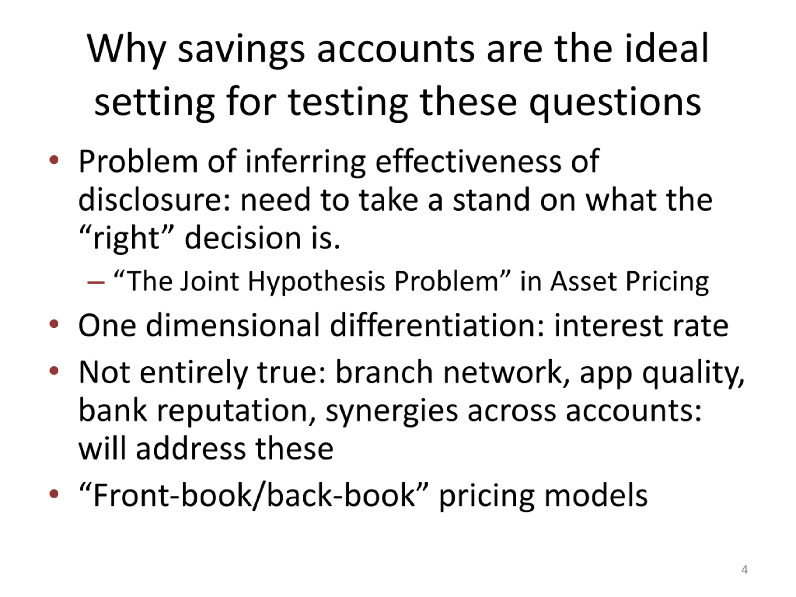 Why savings accounts are the ideal setting for testing these questions Problem of inferring effectiveness of disclosure: need to take a stand on what the right decision is. The Joint Hypothesis Problem in Asset Pricing One dimensional differentiation: interest rate Not entirely true: branch network, app quality, bank reputation, synergies across accounts: will address these Front-book/back-book pricing models 4
