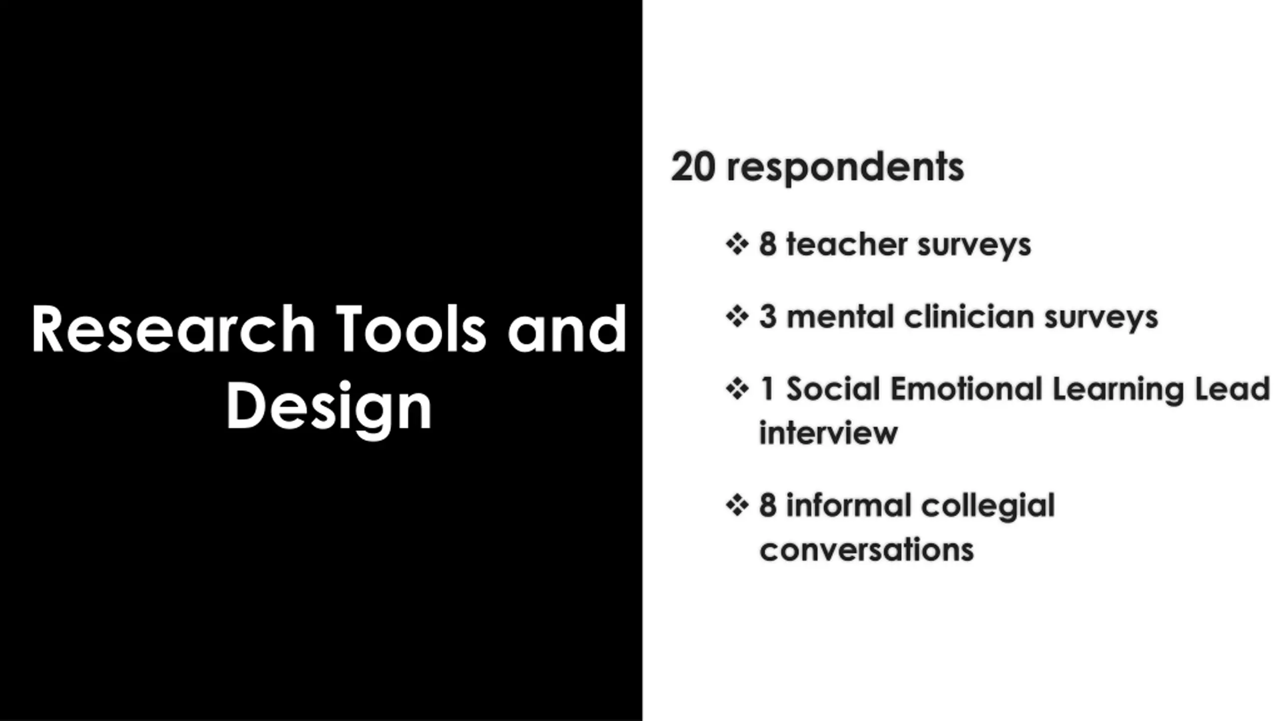 20 respondents 8 teacher surveys Research Tools and Design 3 mental clinician surveys 1 Social Emotional Learning Lead interview 8 informal collegial conversations