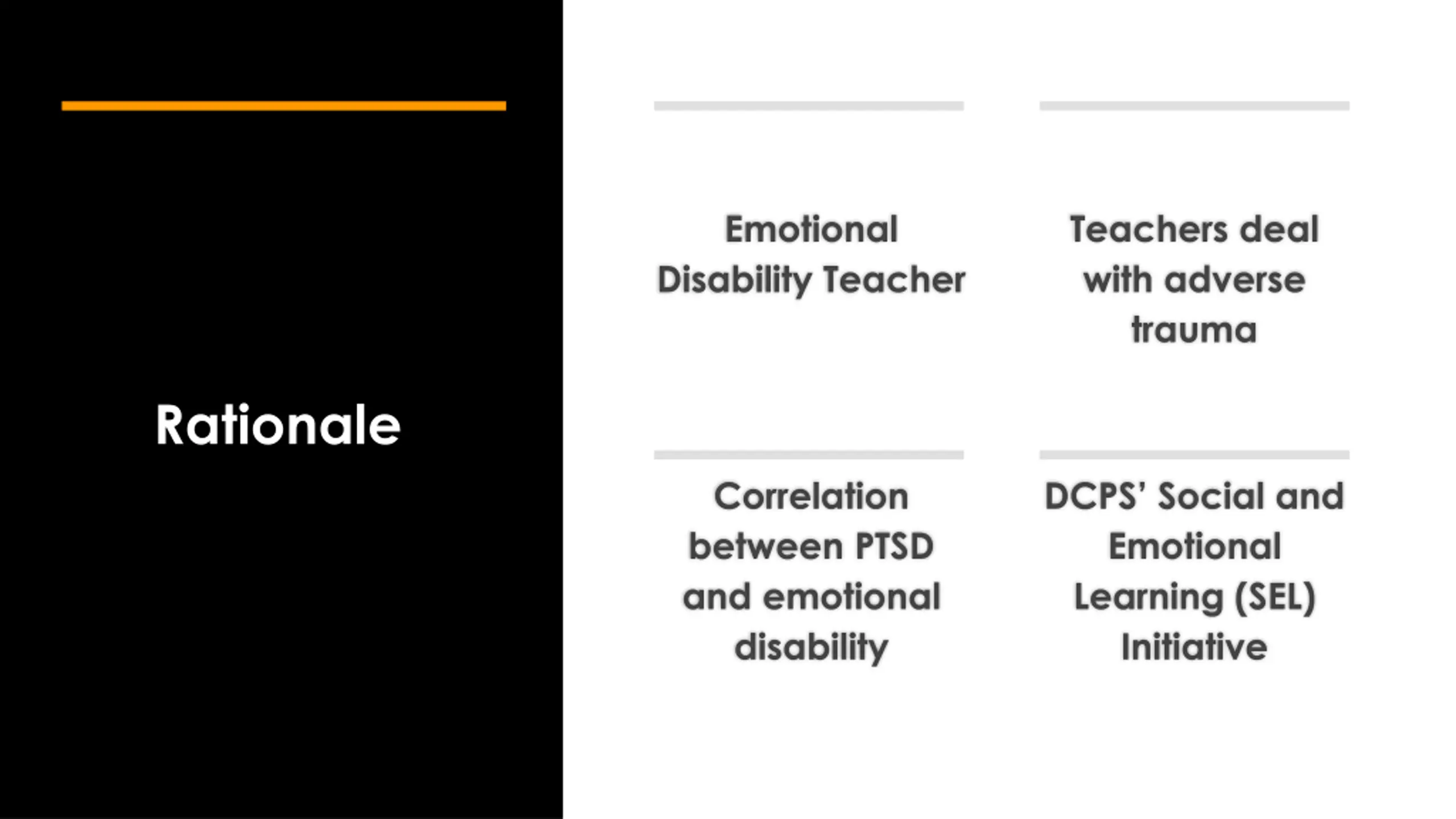 Emotional Disability Teacher Teachers deal with adverse trauma Rationale Correlation between PTSD and emotional disability DCPS Social and Emotional Learning (SEL) Initiative