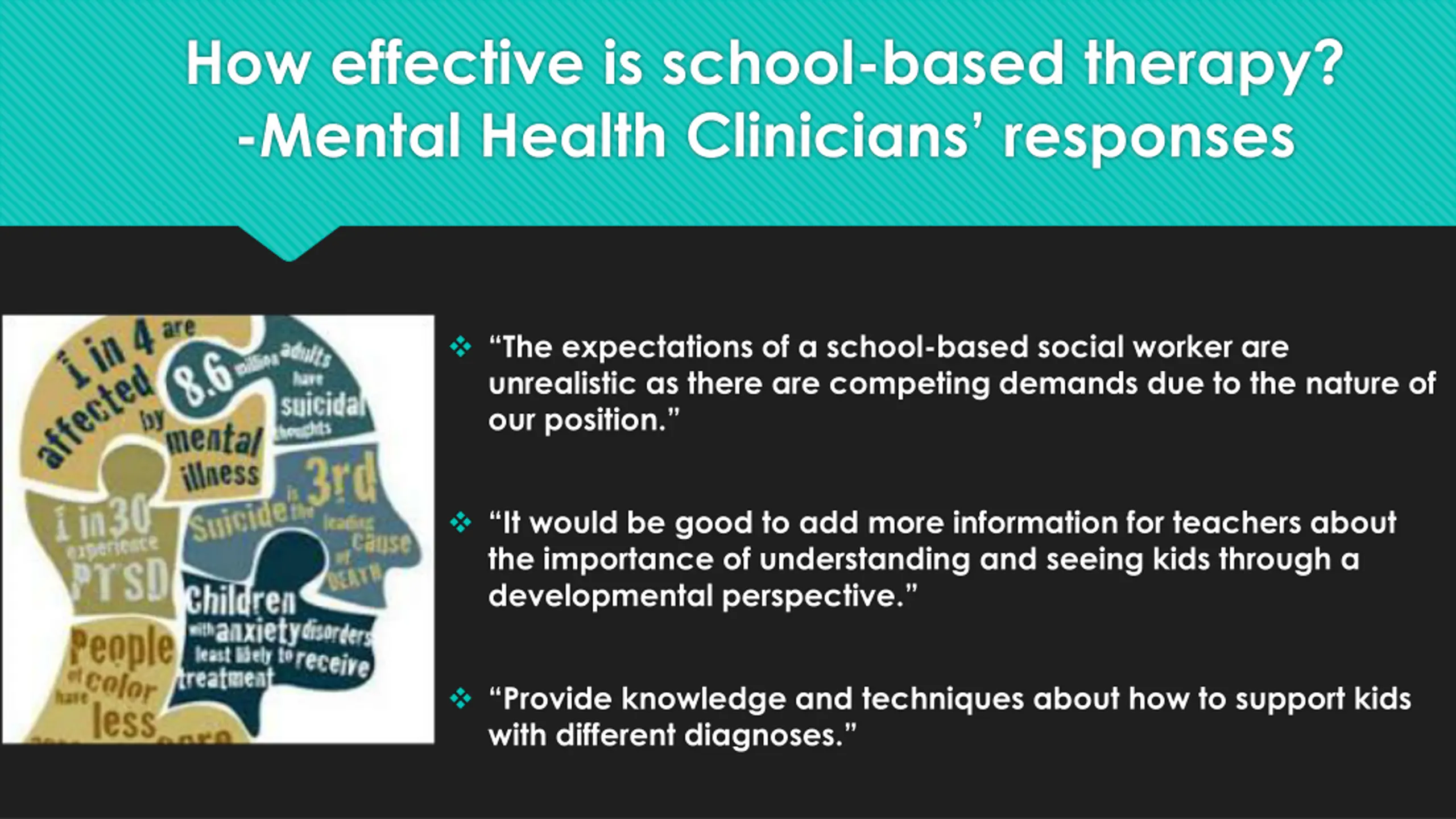 How effective is school-based therapy? -Mental Health Clinicians responses The expectations of a school-based social worker are unrealistic as there are competing demands due to the nature of our position. It would be good to add more information for teachers about the importance of understanding and seeing kids through a developmental perspective. Provide knowledge and techniques about how to support kids with different diagnoses.