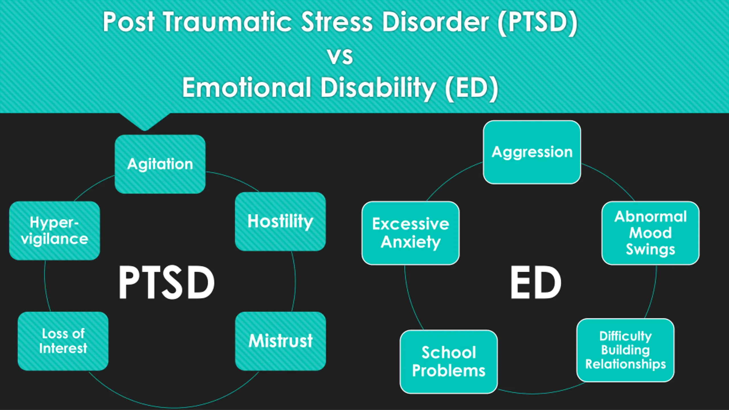 Post Traumatic Stress Disorder (PTSD) vs Emotional Disability (ED) Aggression Agitation Abnormal Mood Swings Hostility Hyper- vigilance Excessive Anxiety PTSD ED Loss of Interest Difficulty Building Relationships Mistrust School Problems
