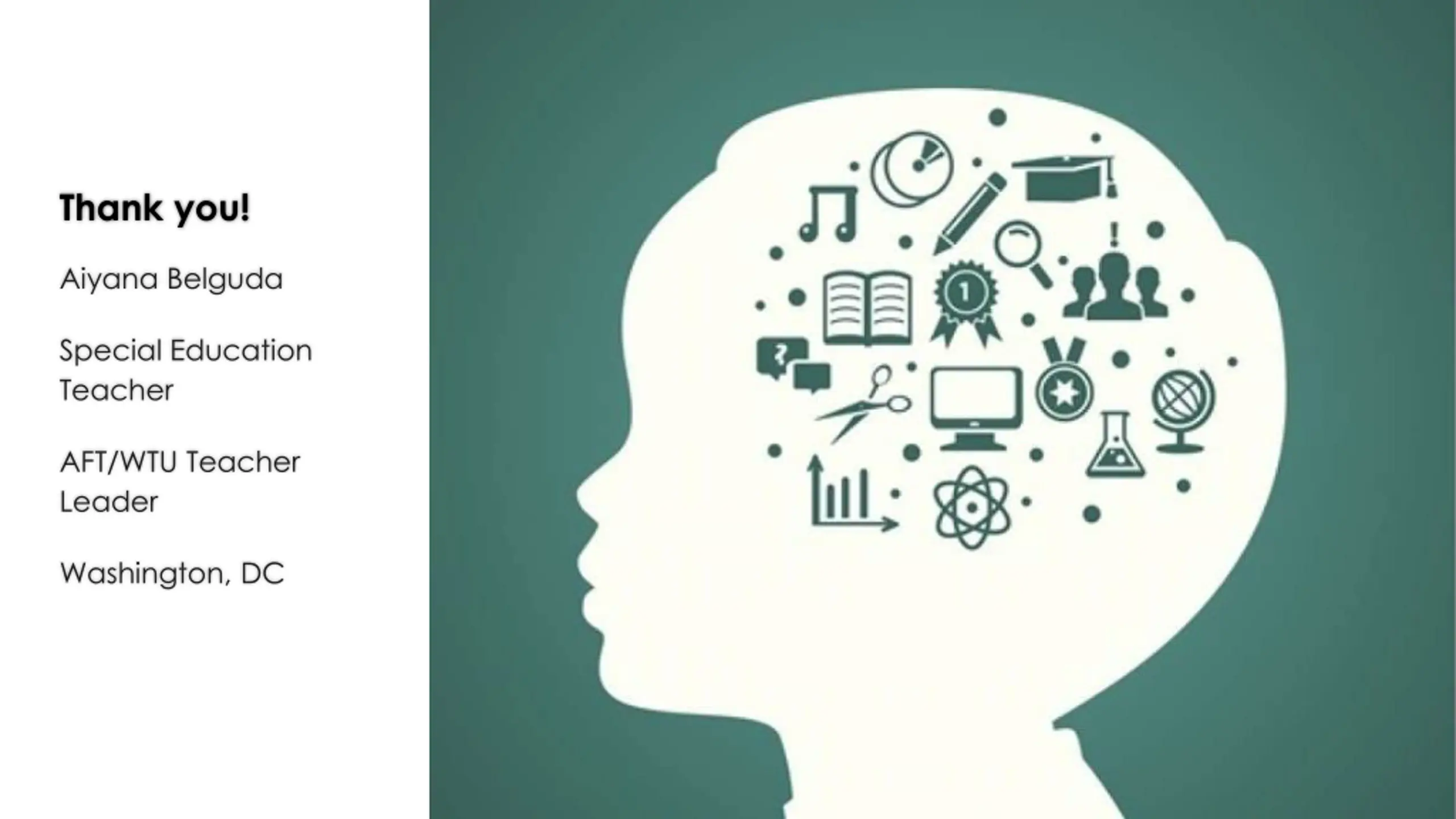 Thank you! Aiyana Belguda Special Education Teacher AFT/WTU Teacher Leader Washington, DC