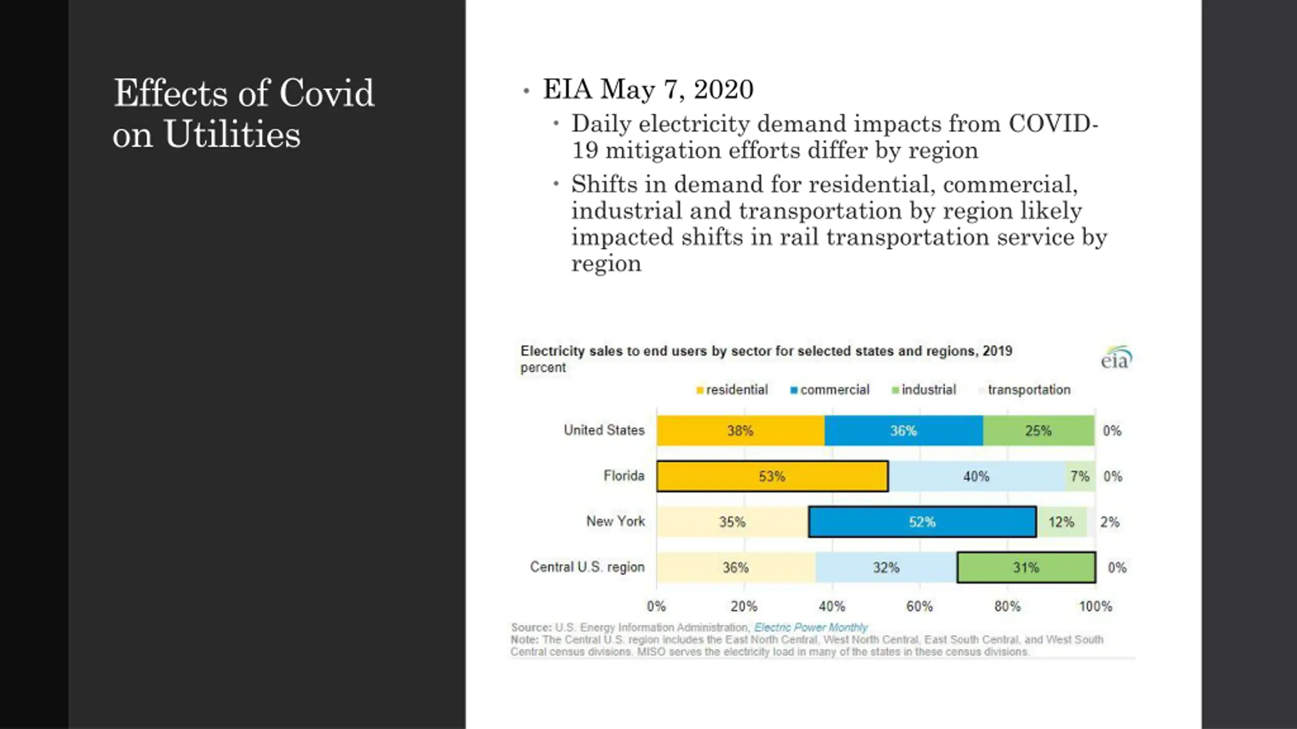 Effects of Covid on Utilities EIA May 7, 2020 Daily electricity demand impacts from COVID- 19 mitigation efforts differ by region Shifts in demand for residential, commercial, industrial and transportation by region likely impacted shifts in rail transportation service by region