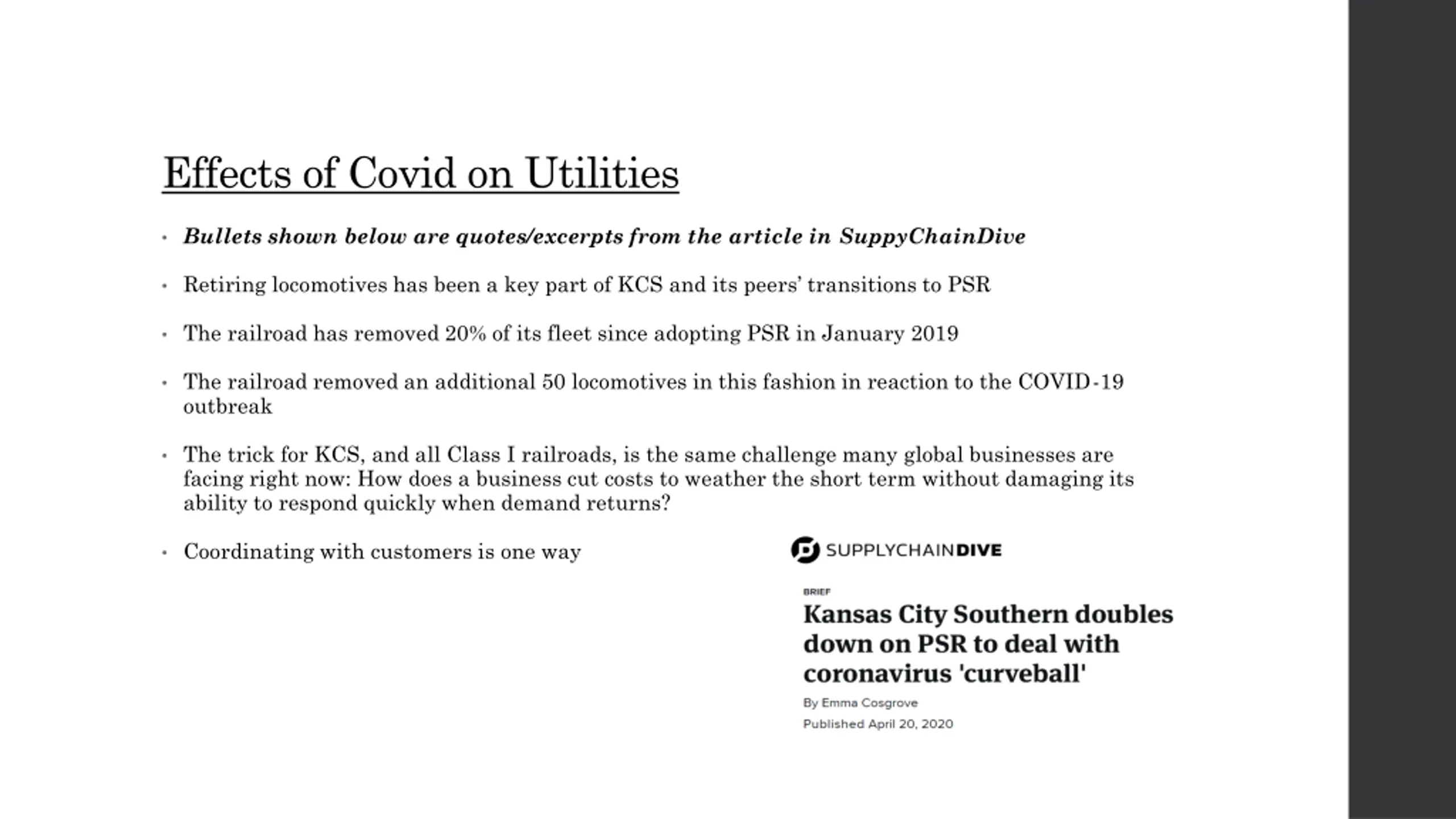 Effects of Covid on Utilities Bullets shown below are quotes/excerpts from the article in SuppyChainDive Retiring locomotives has been a key part of KCS and its peers transitions to PSR The railroad has removed 20% of its fleet since adopting PSR in January 2019 The railroad removed an additional 50 locomotives in this fashion in reaction to the COVID-19 outbreak The trick for KCS, and all Class I railroads, is the same challenge many global businesses are facing right now: How does a business cut costs to weather the short term without damaging its ability to respond quickly when demand returns? Coordinating with customers is one way