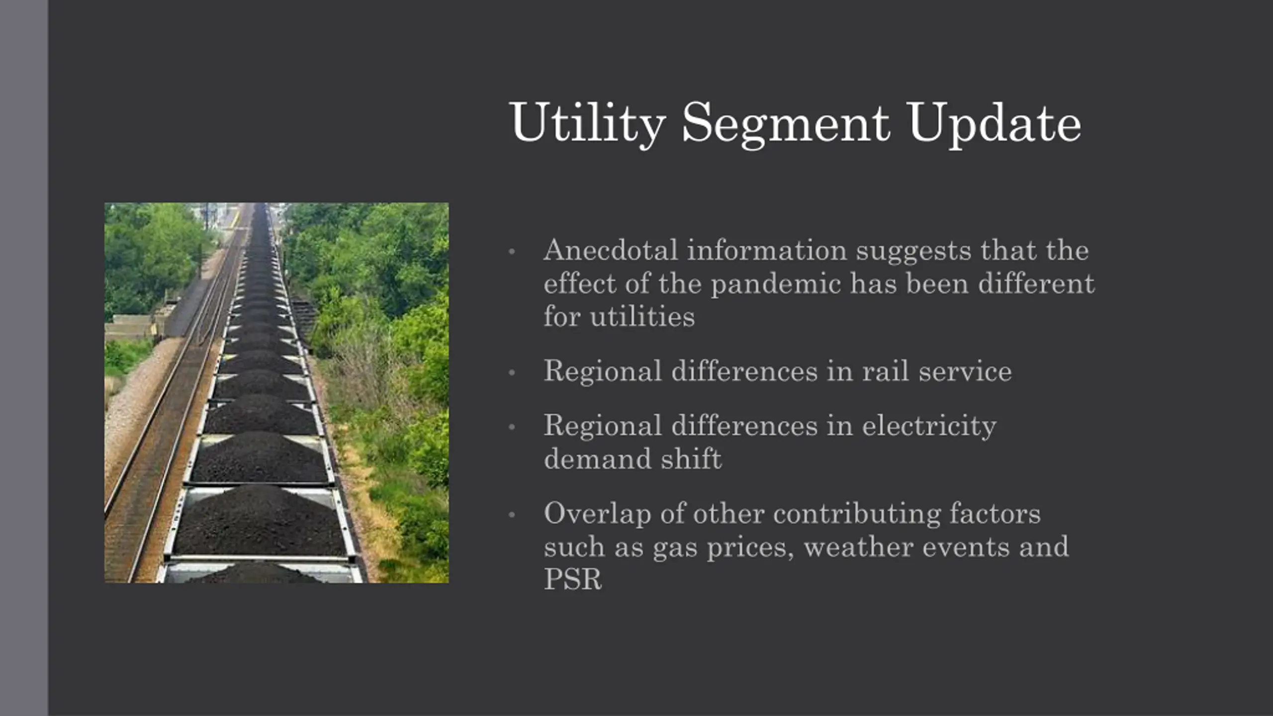 Utility Segment Update Anecdotal information suggests that the effect of the pandemic has been different for utilities Regional differences in rail service Regional differences in electricity demand shift Overlap of other contributing factors such as gas prices, weather events and PSR