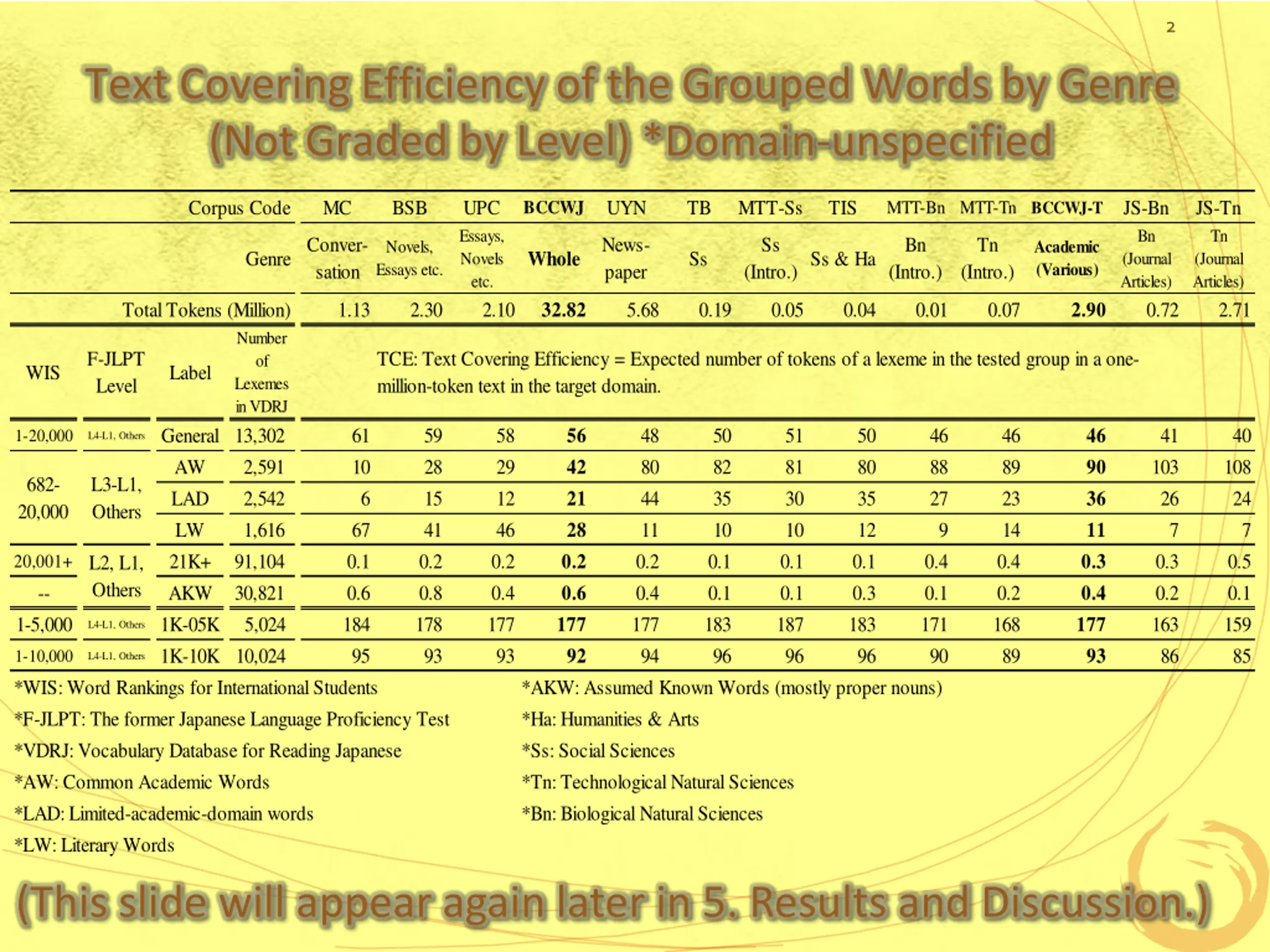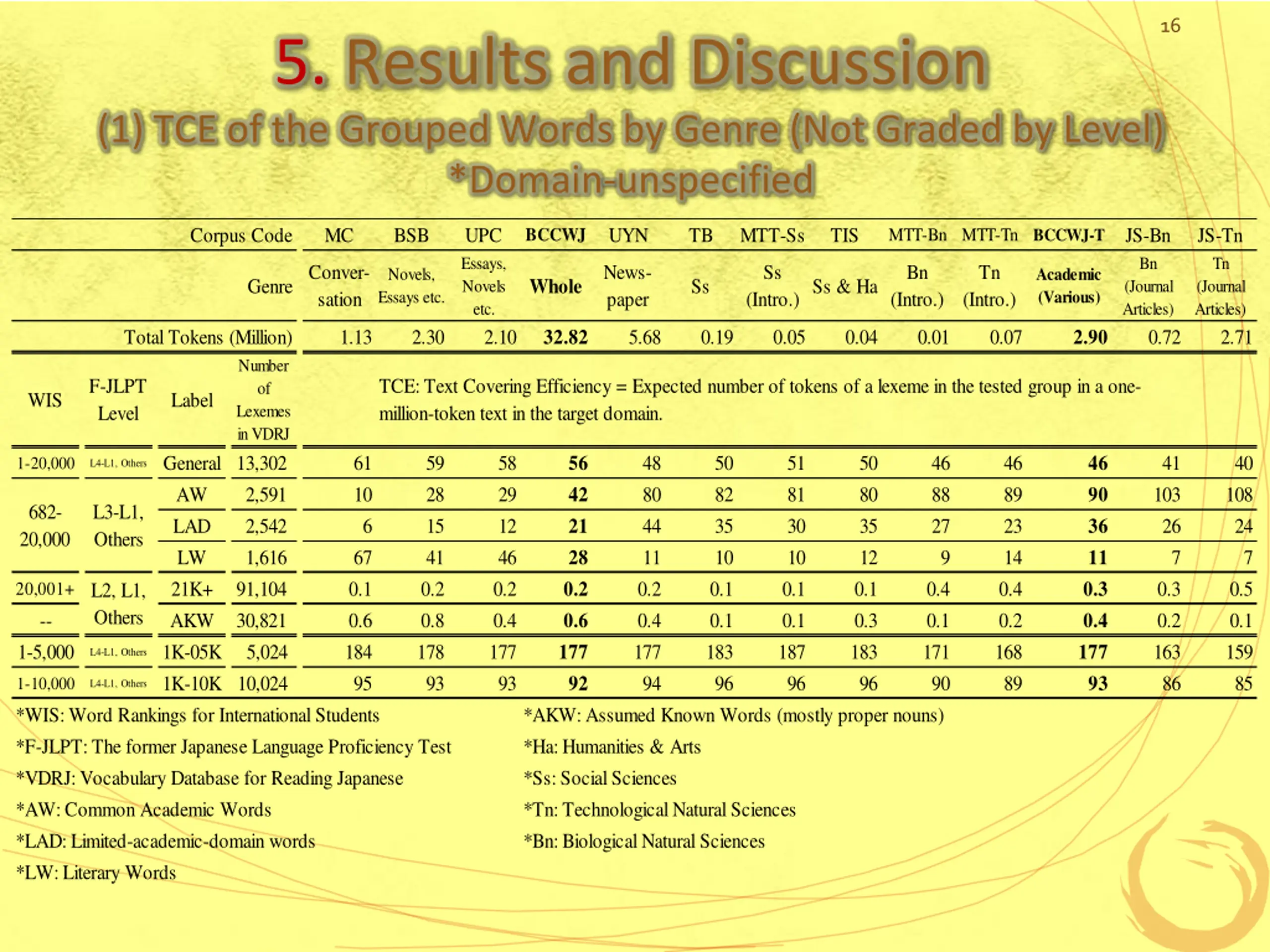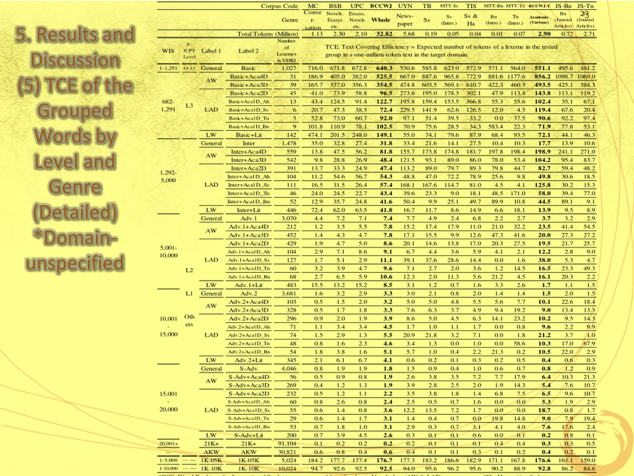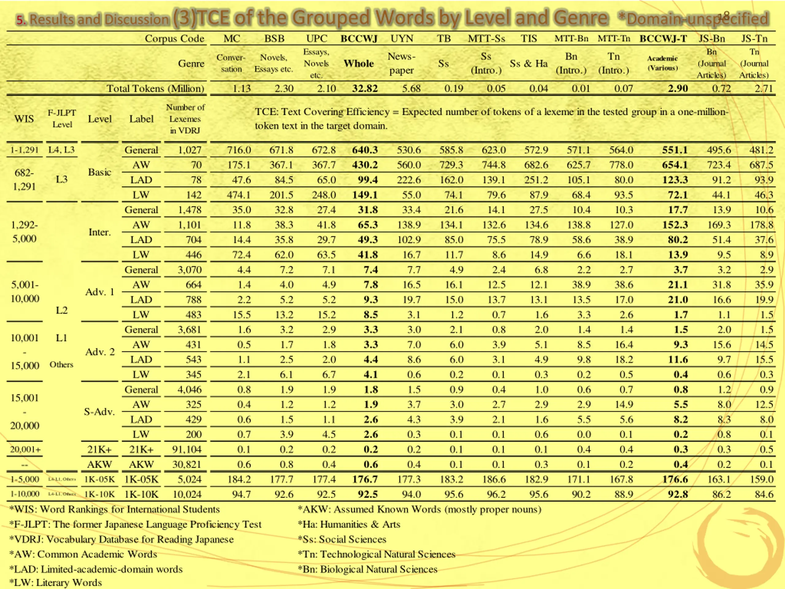5. Results and Discussion(3)TCE of the Grouped Words by Level and Genre *Domain-unspecified Corpus Code MC BSB UPC BCCWJ UYN Essays, Novels etc. paper Total Tokens (Million) 1.13 2.30 2.10 32.82 18 TB MTT-Ss TIS JS-Bn Bn (Journal Articles) JS-Tn Tn (Journal Articles) MTT-Tn BCCWJ-T MTT-Bn News- Ss Bn Tn Conver- sation Novels, Essays etc. Academic (Various) Whole Genre Ss Ss & Ha (Intro.) (Intro.) (Intro.) 2.90 5.68 0.19 0.05 0.04 0.01 0.07 0.72 2.71 Number of Lexemes in VDRJ TCE: Text Covering Efficiency = Expected number of tokens of a lexeme in the tested group in a one-million- token text in the target domain. F-JLPT Level WIS Level Label 640.3 430.2 99.4 149.1 31.8 65.3 49.3 41.8 7.4 7.8 9.3 8.5 3.3 3.3 4.4 4.1 1.8 1.9 2.6 2.6 0.2 0.6 176.7 92.5 551.1 654.1 123.3 72.1 17.7 152.3 80.2 13.9 3.7 21.1 21.0 1.7 1.5 9.3 11.6 0.4 0.8 5.5 8.2 0.2 0.3 0.4 176.6 92.8 General AW LAD LW General AW LAD LW General AW LAD LW General AW LAD LW General AW LAD LW 21K+ AKW 1,027 716.0 175.1 47.6 474.1 35.0 11.8 14.4 72.4 4.4 1.4 2.2 15.5 1.6 0.5 1.1 2.1 0.8 0.4 0.6 0.7 0.1 0.6 184.2 94.7 671.8 367.1 84.5 201.5 32.8 38.3 35.8 62.0 7.2 4.0 5.2 13.2 3.2 1.7 2.5 6.1 1.9 1.2 1.5 3.9 0.2 0.8 177.7 92.6 672.8 367.7 65.0 248.0 27.4 41.8 29.7 63.5 7.1 4.9 5.2 15.2 2.9 1.8 2.0 6.7 1.9 1.2 1.1 4.5 0.2 0.4 177.4 92.5 530.6 560.0 222.6 55.0 33.4 138.9 102.9 16.7 7.7 16.5 19.7 3.1 3.0 7.0 8.6 0.6 1.5 3.7 4.3 0.3 0.2 0.4 177.3 94.0 585.8 729.3 162.0 74.1 21.6 134.1 85.0 11.7 4.9 16.1 15.0 1.2 2.1 6.0 6.0 0.2 0.9 3.0 3.9 0.1 0.1 0.1 183.2 95.6 623.0 744.8 139.1 79.6 14.1 132.6 75.5 8.6 2.4 12.5 13.7 0.7 0.8 3.9 3.1 0.1 0.4 2.7 2.1 0.1 0.1 0.1 186.6 96.2 572.9 682.6 251.2 87.9 27.5 134.6 78.9 14.9 6.8 12.1 13.1 1.6 2.0 5.1 4.9 0.3 1.0 2.9 1.6 0.6 0.1 0.3 182.9 95.6 571.1 625.7 105.1 68.4 10.4 138.8 58.6 6.6 2.2 38.9 13.5 3.3 1.4 8.5 9.8 0.2 0.6 2.9 5.5 0.0 0.4 0.1 171.1 90.2 564.0 778.0 80.0 93.5 10.3 127.0 38.9 18.1 2.7 38.6 17.0 2.6 1.4 16.4 18.2 0.5 0.7 14.9 5.6 0.1 0.4 0.2 167.8 88.9 495.6 723.4 91.2 44.1 13.9 169.3 51.4 9.5 3.2 31.8 16.6 1.1 2.0 15.6 9.7 0.6 1.2 8.0 8.3 0.8 0.3 0.2 163.1 86.2 481.2 687.5 93.9 46.3 10.6 178.8 37.6 8.9 2.9 35.9 19.9 1.5 1.5 14.5 15.5 0.3 0.9 12.5 8.0 0.1 0.5 0.1 159.0 84.6 L4, L3 1-1,291 70 78 142 Basic 682- 1,291 L3 1,478 1,101 704 446 3,070 664 788 483 3,681 431 543 345 4,046 325 429 200 91,104 30,821 5,024 10,024 1,292- 5,000 Inter. 5,001- 10,000 Adv. 1 L2 10,001 - 15,000 L1 Adv. 2 Others 15,001 - 20,000 S-Adv. 21K+ AKW 1K-05K 1K-05K 1K-10K 1K-10K 20,001+ -- 1-5,000 L4-L1, Others 1-10,000 *WIS: Word Rankings for International Students *F-JLPT: The former Japanese Language Proficiency Test *VDRJ: Vocabulary Database for Reading Japanese *AW: Common Academic Words *LAD: Limited-academic-domain words *LW: Literary Words L4-L1, Others *AKW: Assumed Known Words (mostly proper nouns) *Ha: Humanities & Arts *Ss: Social Sciences *Tn: Technological Natural Sciences *Bn: Biological Natural Sciences