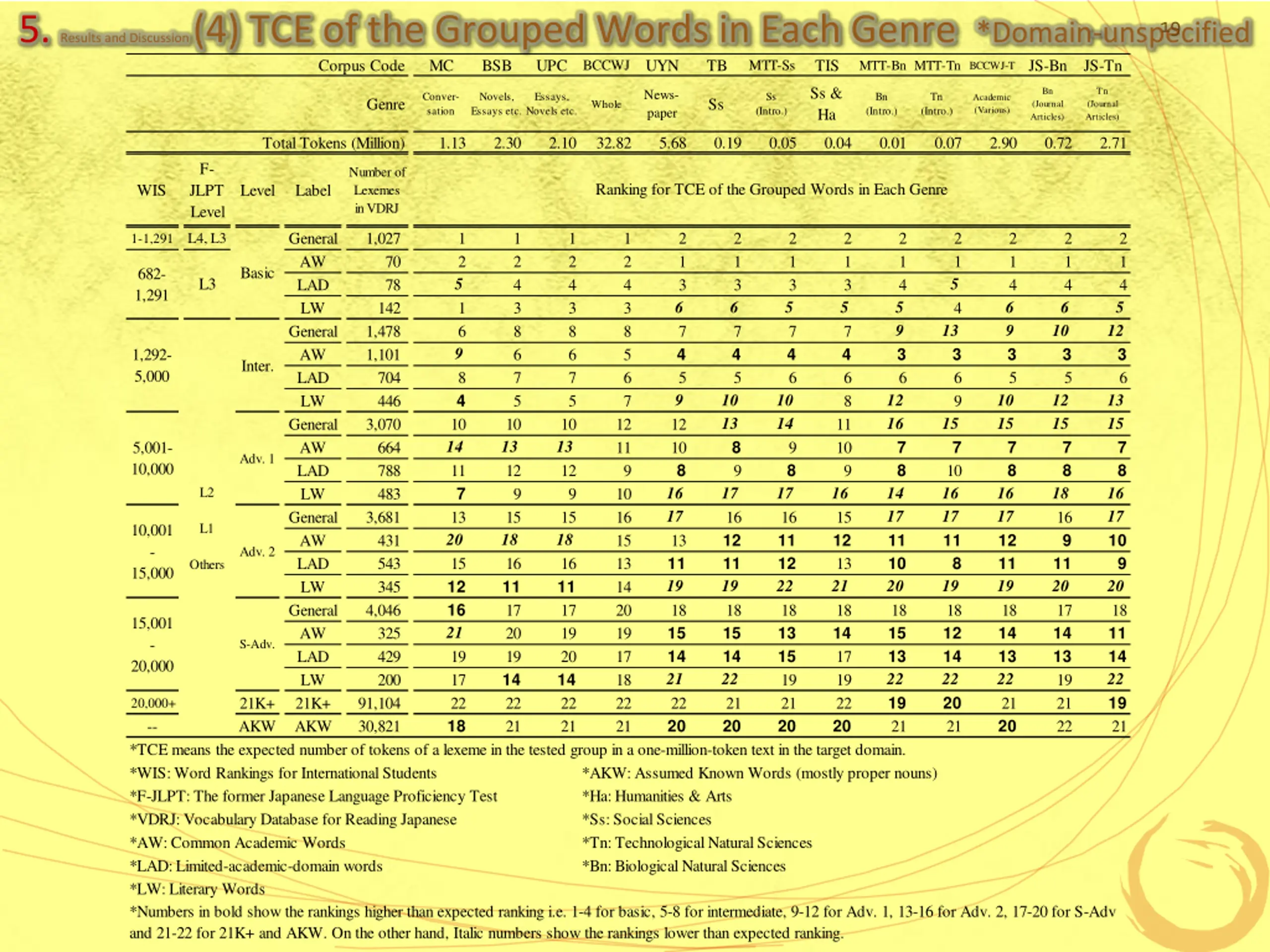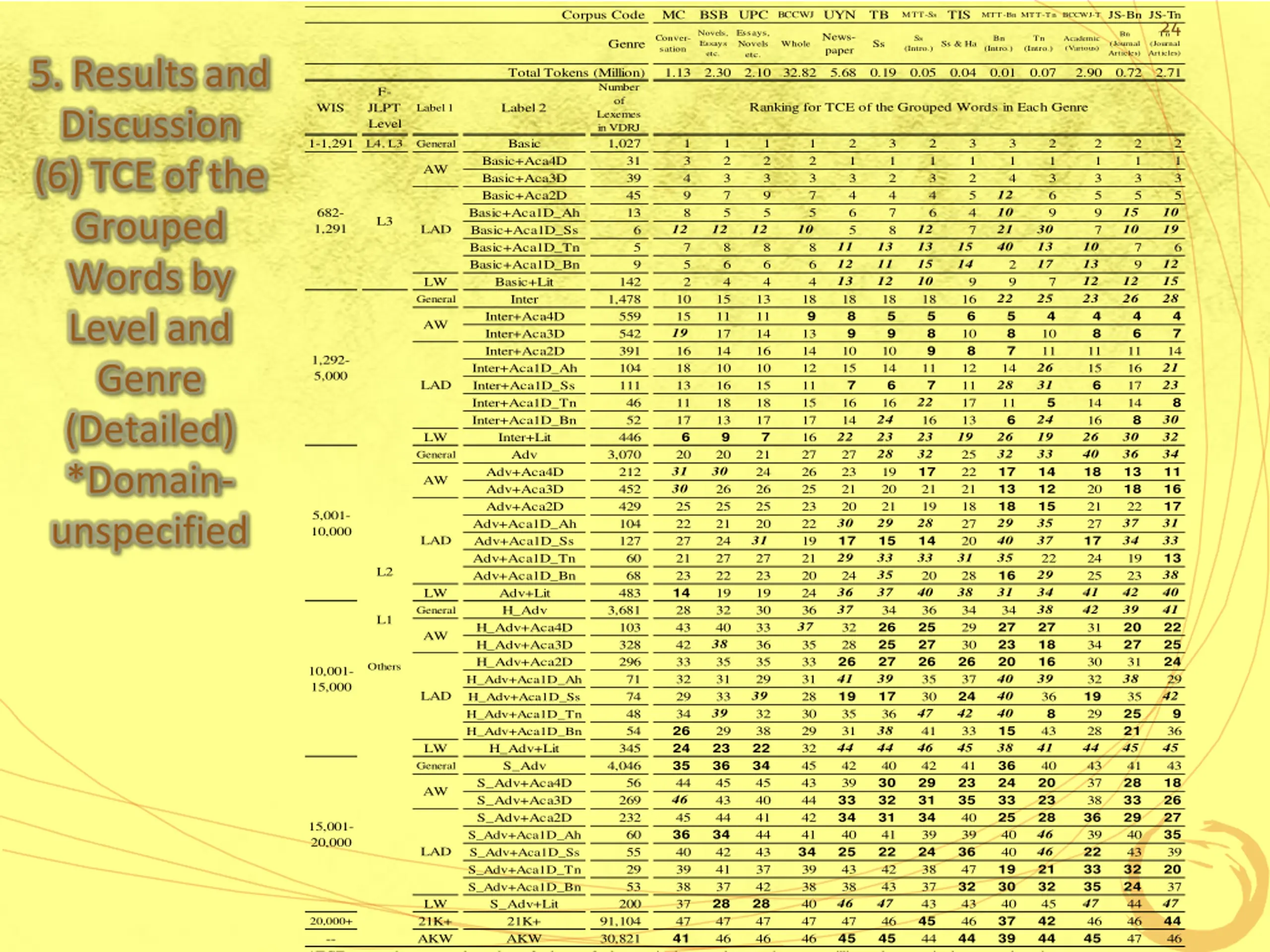 5. Results and Discussion(4) TCE of the Grouped Words in Each Genre *Domain-unspecified Corpus Code MC BSB UPC BCCWJ 19 UYN TB TIS MTT-Bn MTT-Tn BCCWJ-T JS-Bn JS-Tn MTT-Ss Ss & Ha Bn Tn News- paper Conver- sation Novels, Essays etc. Essays, Novels etc. Ss Bn Tn Academic (Various) Genre Ss Whole (Journal Articles) (Journal Articles) (Intro.) (Intro.) (Intro.) Total Tokens (Million) 1.13 2.30 2.10 32.82 5.68 0.19 0.05 0.04 0.01 0.07 2.90 0.72 2.71 F- Number of Lexemes in VDRJ Ranking for TCE of the Grouped Words in Each Genre WIS JLPT Level Level Label General AW LAD LW General AW LAD LW General AW LAD LW General AW LAD LW General AW LAD LW 21K+ AKW 1,027 1 2 5 1 6 9 8 4 10 14 11 1 2 4 3 8 6 7 5 1 2 4 3 8 6 7 5 1 2 4 3 8 5 6 7 2 1 3 6 7 4 5 9 12 10 8 16 17 13 11 19 18 15 14 21 22 20 2 1 3 6 7 4 5 2 1 3 5 7 4 6 2 1 3 5 7 4 6 8 11 10 9 16 15 12 13 21 18 14 17 19 22 20 2 1 4 5 9 3 6 2 1 5 4 2 1 4 6 9 3 5 2 1 4 6 2 1 4 5 L4, L3 1-1,291 70 78 142 Basic 682- 1,291 L3 13 10 12 1,478 1,101 704 446 3,070 664 788 483 3,681 431 543 345 4,046 325 429 200 91,104 30,821 3 6 9 3 5 3 6 1,292- 5,000 Inter. 10 13 10 14 12 16 10 15 12 15 13 15 15 10 13 12 10 13 12 12 11 9 10 16 15 13 14 20 19 17 18 22 21 8 9 7 8 7 7 8 7 8 7 8 5,001- 10,000 9 8 Adv. 1 10 16 17 11 17 16 12 11 19 18 15 14 22 21 20 17 16 11 12 22 18 13 15 19 21 20 14 17 11 10 20 18 15 13 22 19 21 16 17 12 11 19 18 14 13 22 21 20 18 16 16 17 10 7 L2 9 9 13 20 15 12 16 21 19 17 22 18 15 18 16 11 17 20 19 14 22 21 15 18 16 11 17 19 20 14 22 21 L1 10,001 - 15,000 9 Adv. 2 8 11 20 17 14 13 19 21 22 9 Others 19 18 12 14 22 20 21 20 18 11 14 22 19 21 15,001 - 20,000 S-Adv. 21K+ AKW 20,000+ -- *TCE means the expected number of tokens of a lexeme in the tested group in a one-million-token text in the target domain. *WIS: Word Rankings for International Students *F-JLPT: The former Japanese Language Proficiency Test *VDRJ: Vocabulary Database for Reading Japanese *AW: Common Academic Words *LAD: Limited-academic-domain words *LW: Literary Words *Numbers in bold show the rankings higher than expected ranking i.e. 1-4 for basic, 5-8 for intermediate, 9-12 for Adv. 1, 13-16 for Adv. 2, 17-20 for S-Adv and 21-22 for 21K+ and AKW. On the other hand, Italic numbers show the rankings lower than expected ranking. *AKW: Assumed Known Words (mostly proper nouns) *Ha: Humanities & Arts *Ss: Social Sciences *Tn: Technological Natural Sciences *Bn: Biological Natural Sciences