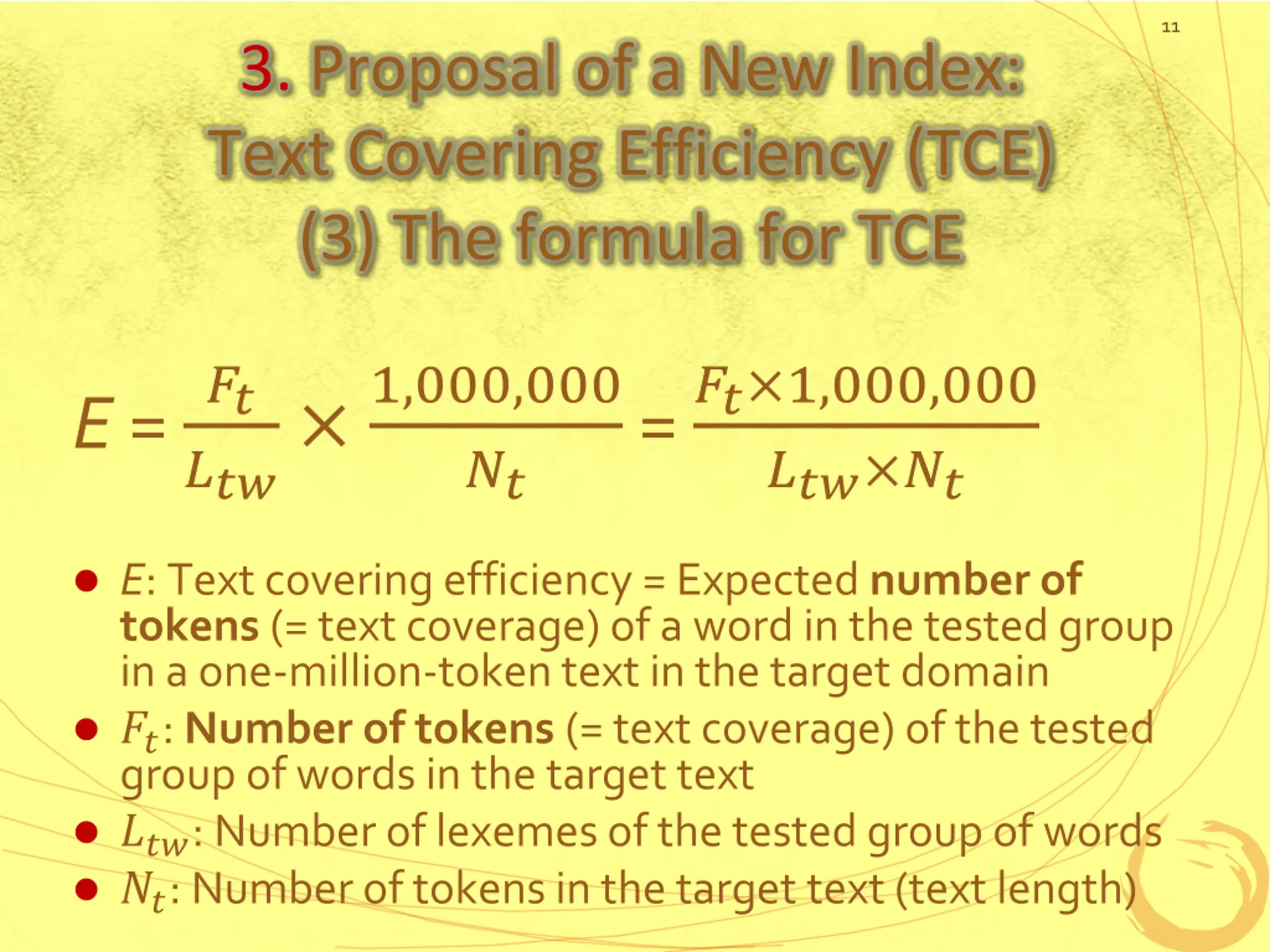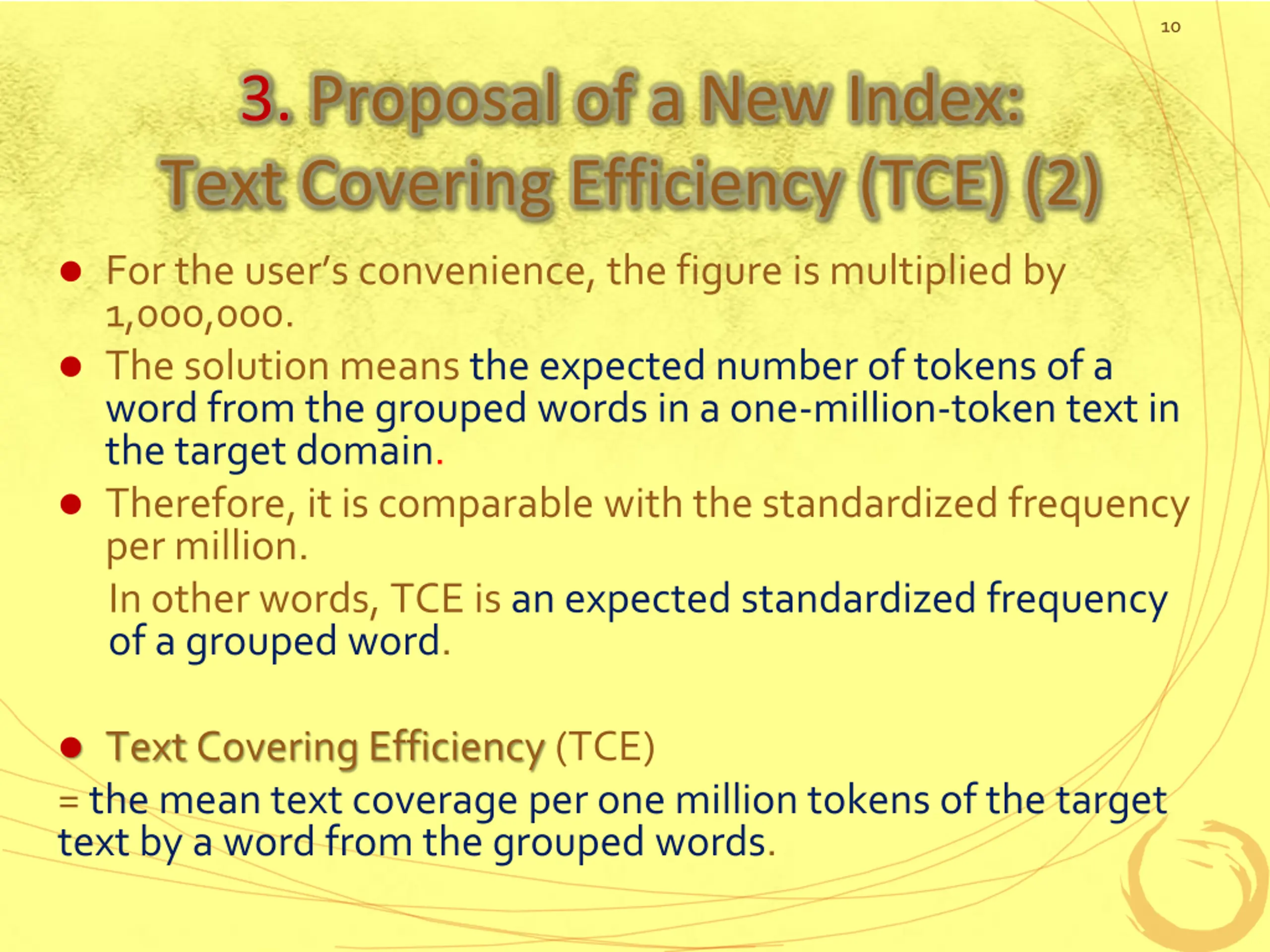 10 3. Proposal of a New Index: Text Covering Efficiency (TCE) (2) For the user s convenience, the figure is multiplied by 1,000,000. The solution means the expected number of tokens of a word from the grouped words in a one-million-token text in the target domain. Therefore, it is comparable with the standardized frequency per million. In other words, TCE is an expected standardized frequency of a grouped word. Text Covering Efficiency (TCE) = the mean text coverage per one million tokens of the target text by a word from the grouped words.
