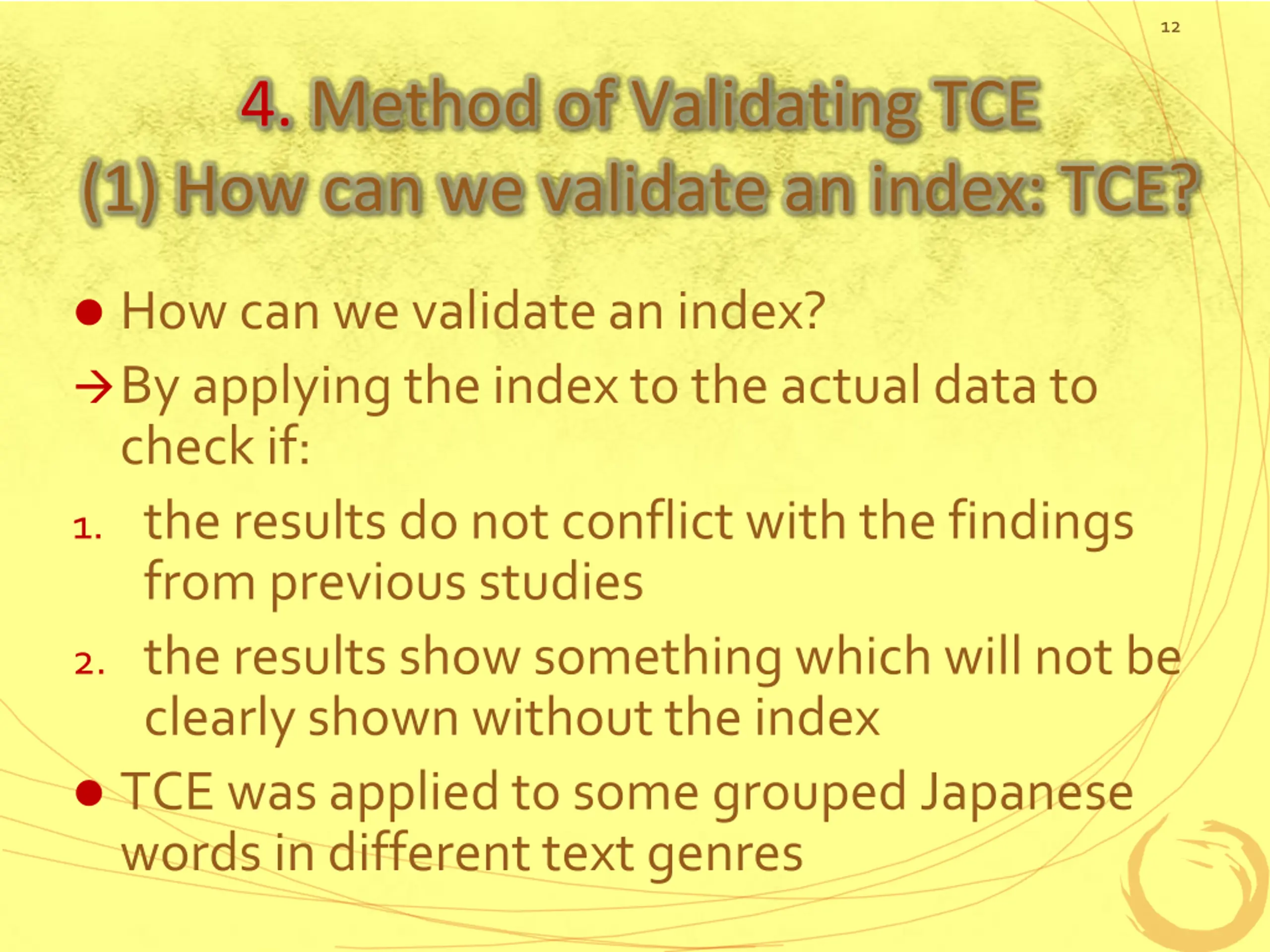 12 4. Method of Validating TCE (1) How can we validate an index: TCE? How can we validate an index? By applying the index to the actual data to check if: 1. the results do not conflict with the findings from previous studies 2. the results show something which will not be clearly shown without the index TCE was applied to some grouped Japanese words in different text genres